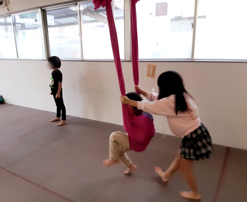 友だち二人か一緒にハンモックに乗ってるのを見て、「私もハンモック乗りたい」と言う女の子。