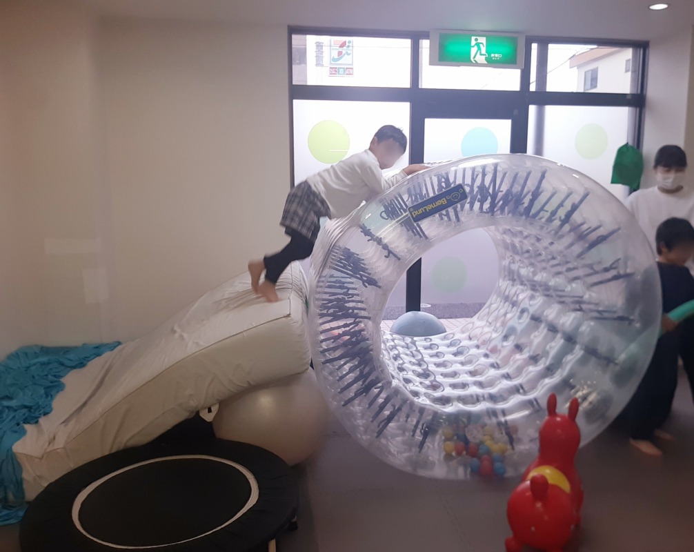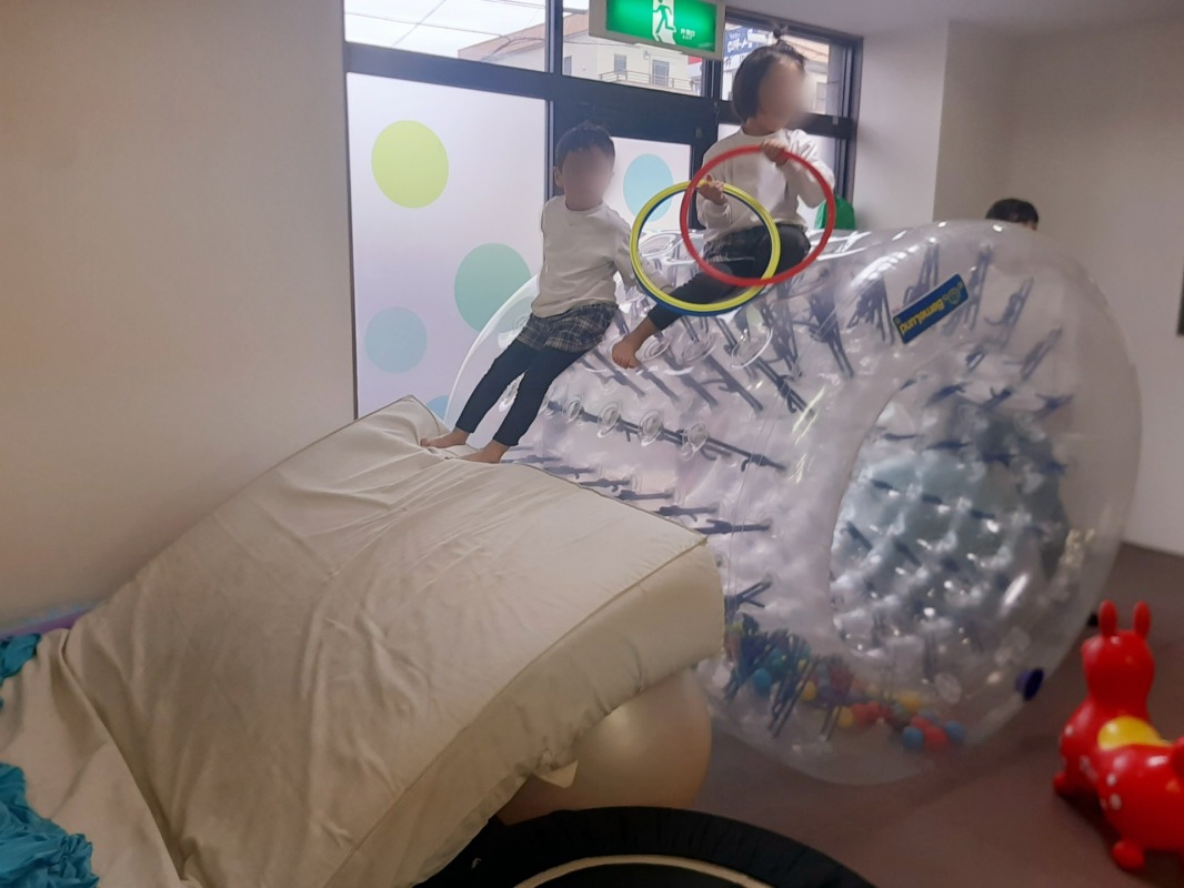 2026.3.17 サイバーホイール+マット 日々のこと サイバーホイールとマットを組み合わせて、こんな大型遊具ができあがりました。広さに限りある室内で、大きく身体を動かせるよう、工夫して環境を設定しています。