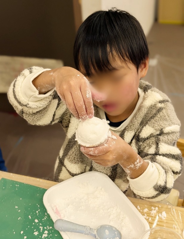 2025.12.15 溶けない雪あそび 日々のこと 先週土曜日、きのねでのイベントの様子です。溶けない雪を作ってあそびました!魔法の粉に、魔法の液体を入れて…みんなでよーく混ぜたら…溶けない雪の出来上がり!雪だるまつくろう!まるで本当の雪みたいだね!同じ日にironohaでも溶けない雪づくりをしました。こちらは、カラフルな作品ができあがりましたよ。