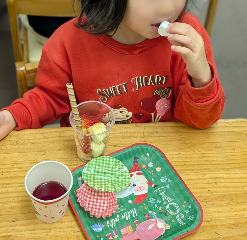 2025.12.21 きのね クリスマス会 日々のこと きのねのクリスマス会の様子です。素敵なクリスマスの飾りを作りました!毎年恒例のピニャータはやっぱり大盛りあがり!お菓子たくさんゲットできたかな?今年のクリスマスデザートは、パフェ作り!かわいくできたね。サンタさんからプレゼントももらって、大満足のきのねの子どもたちです!みんなニコニコ笑顔がはじけてましたよ。