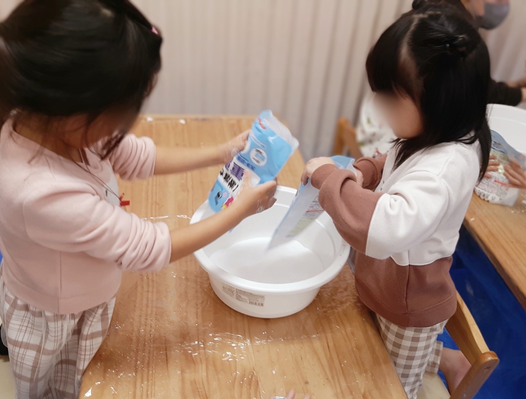 触ることに抵抗があり、ビニール手袋をしながらやっていた子も、「外したほうがやりやすい!」と自分から外して、感触を楽しむことができました。