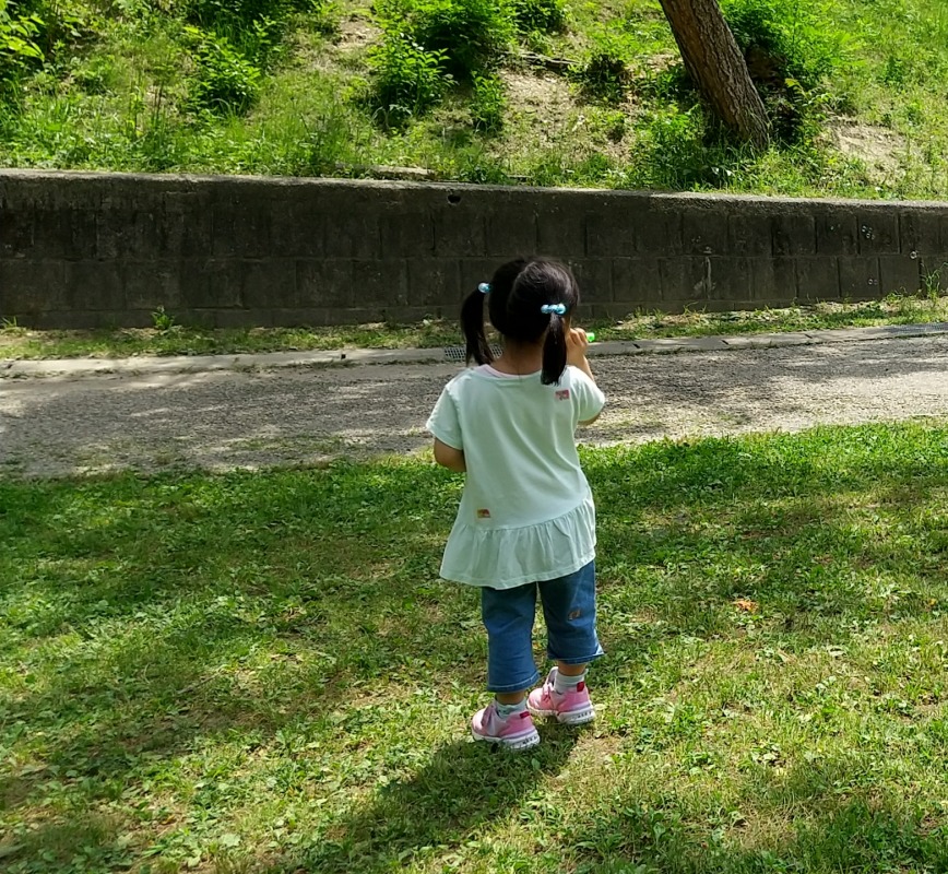 ボランティアのお兄さんにシャボン玉をつかまえてもらってますよ。とっても嬉しそう。