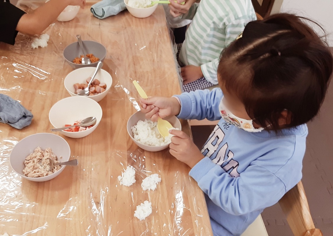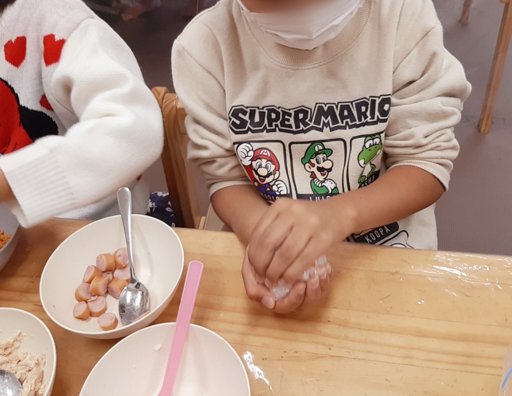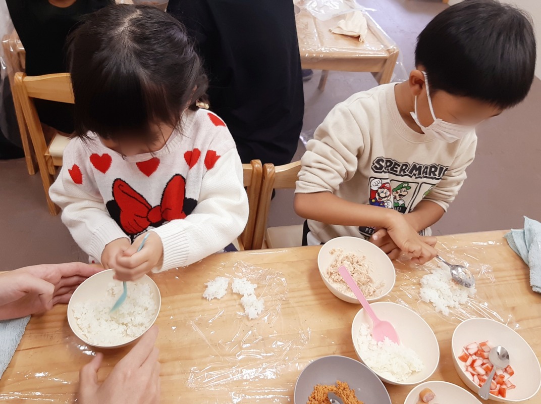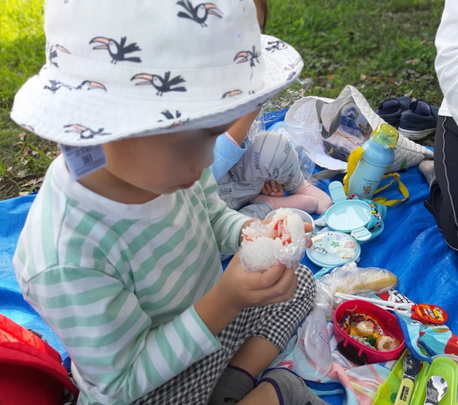 2024.11.8 きのね おにぎり作ってピクニック 日々のこと おにぎり作ってピクニック。どんなおにぎりができるかな?好きな具を入れて、ラップを使ってぎゅっと握ったら、自分だけのおにぎりの完成です!公園へ出かけて、遊具でたくさんあそんだ後は、お待ちかねのお弁当タイム!自分で作ったおにぎにの味は、やっぱり格別でした!お弁当の後は、シャボン玉したりボールあそびしたり、キノコ探しをしたり。友だちやスタッフと一緒に、思い思いに楽しみましたよ。