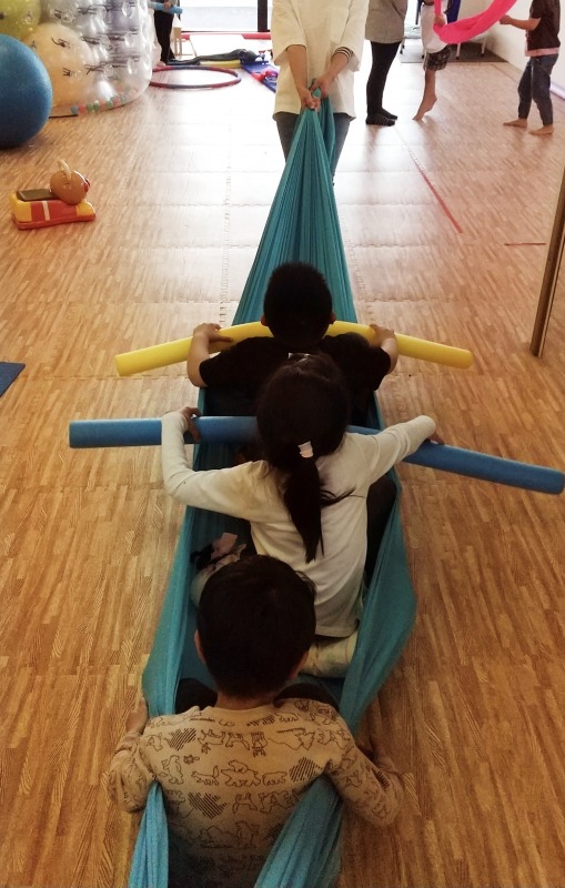 2021.5.17 ソリあそび 日々のこと スタッフに引っ張ってもらってごきげん。まるでボートに乗ってるみたい。破れたハンモックの布を捨てずに置いておくと、そこからあそびがたくさん広がりました。子どもたちはあそびを考え出す天才です!友だちと「楽しいね」を共有しながら、発達に必要な感覚が自然に入っていきます。布で触覚にもアプローチしながら、平衡感覚がしっかり入り、姿勢保持力や正中線(身体の中心軸)の形成に役立ちます。