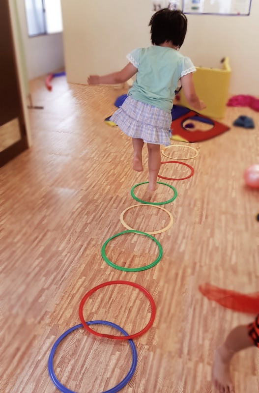 特別にケンケンの練習をしなくても、ハンモックで揺れたり、トランポリンでジャンプしたり、サイバーホイールによじ登ったりと、様々な粗大運動をすることにより、「ケンケンができる土台」が整った結果、いつの間にかケンケンができるようになるのです。