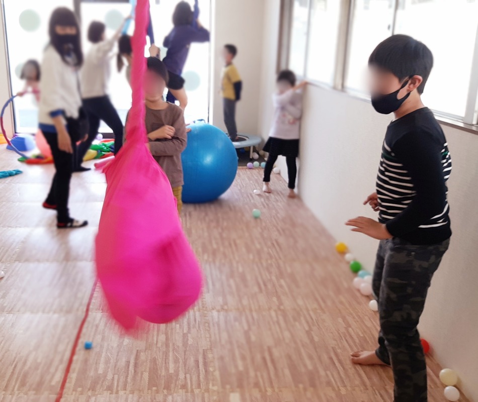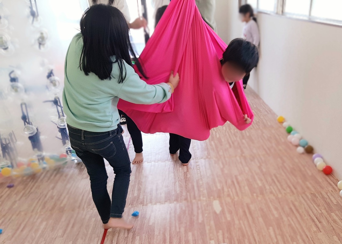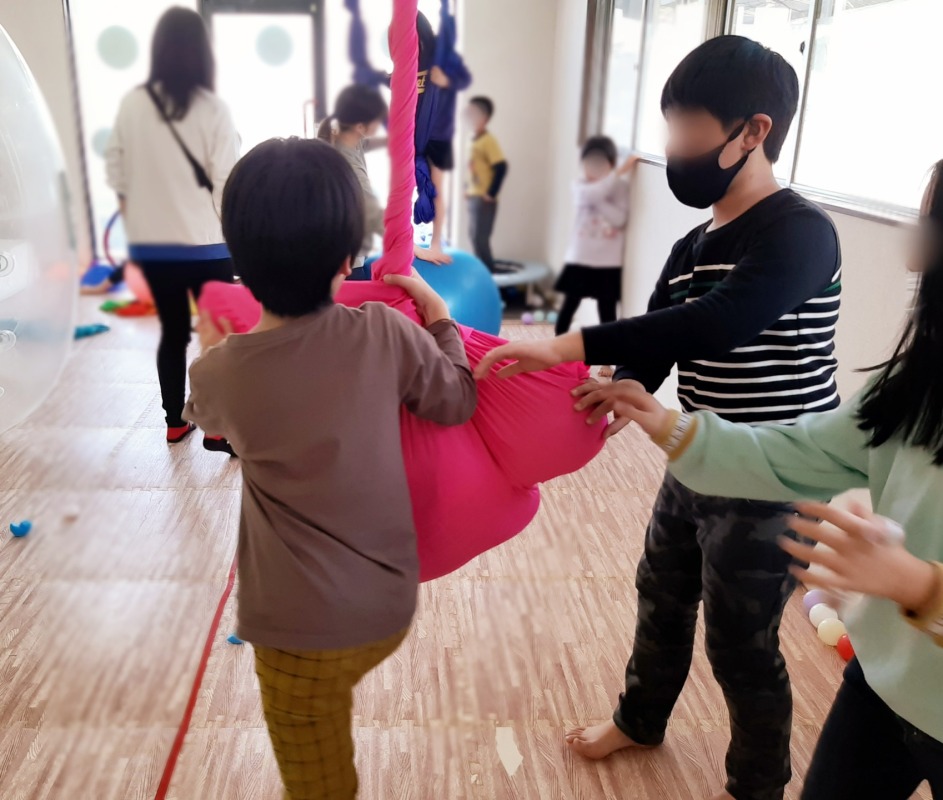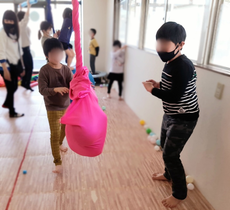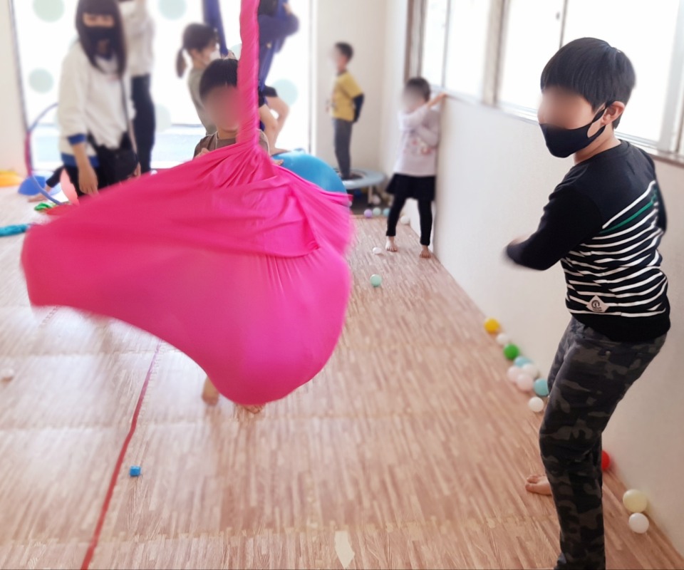 きのねでは、できない事を繰り返し練習させるのではなく、楽しくあそぶ中で、揺れや回る感覚が脳に届きやすくなるようアプローチしていきます。