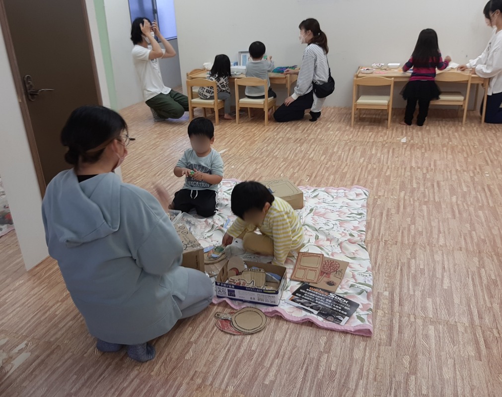 床に座ってするおままごとや人形あそびのコーナー、お絵かきや工作のコーナー、ヒモ通しなど手先を使ったあそびのコーナー、積み木やタングラムなど形づくりのコーナー、というように、目的別にコーナーに分けるようにしました。