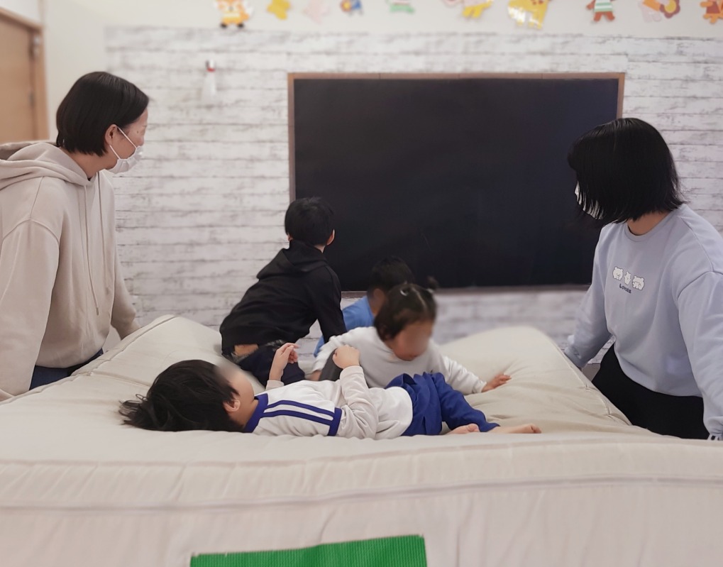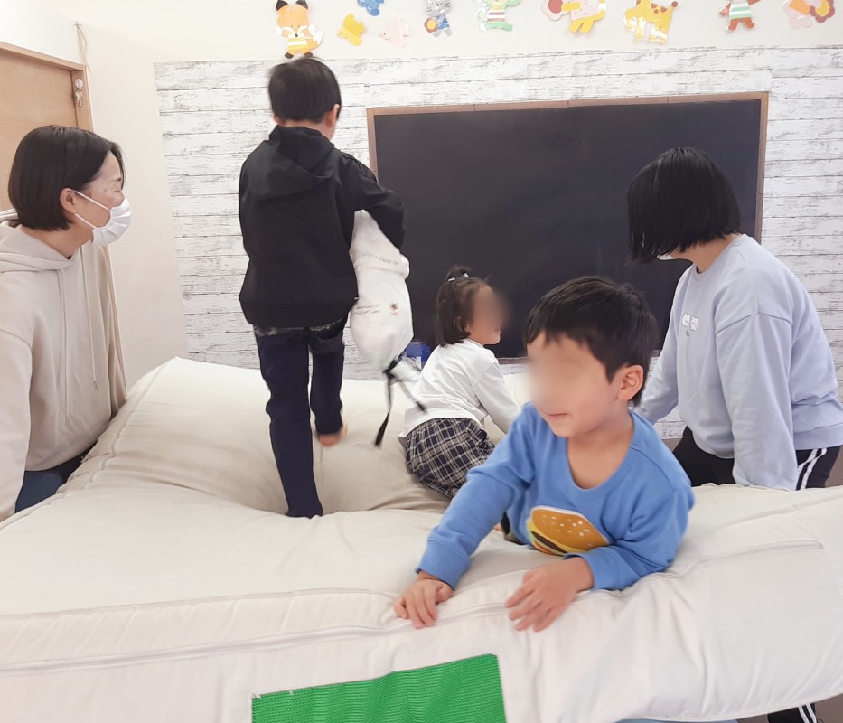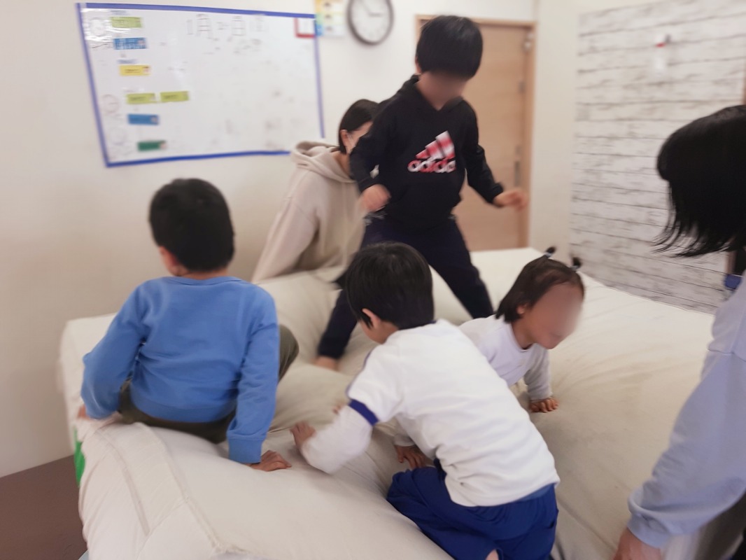 2025.2.6 ゆらゆらあそび 日々のこと ゆらゆらあそび。バランスボールの上にマットを載せているので、かなり不安定でゆらゆら揺れます。うまく立てるかな?友だちと一緒に楽しくあそびながら、バランス感覚や姿勢保持力を付けていきます。そして、「楽しいね!」の共有が、他者との関わりやコミュニケーションの、しっかりとした土台になっていきます。
