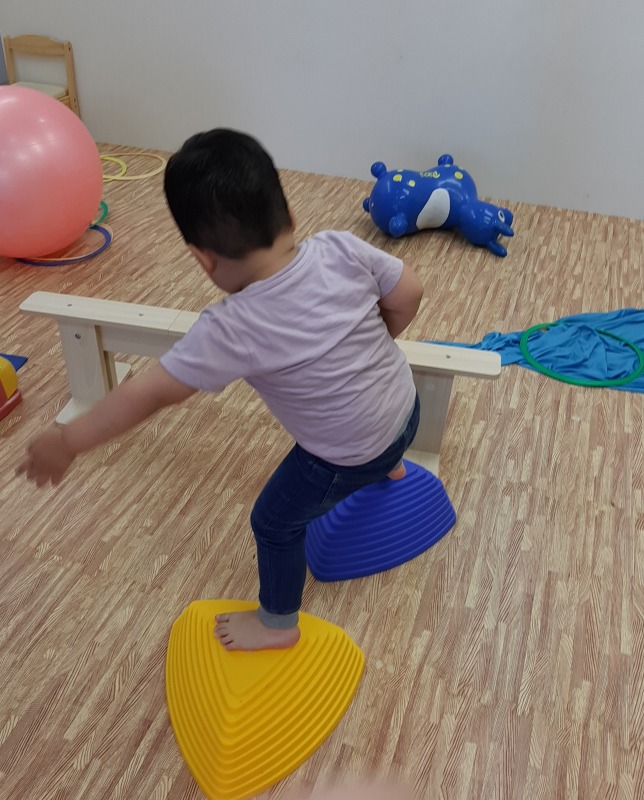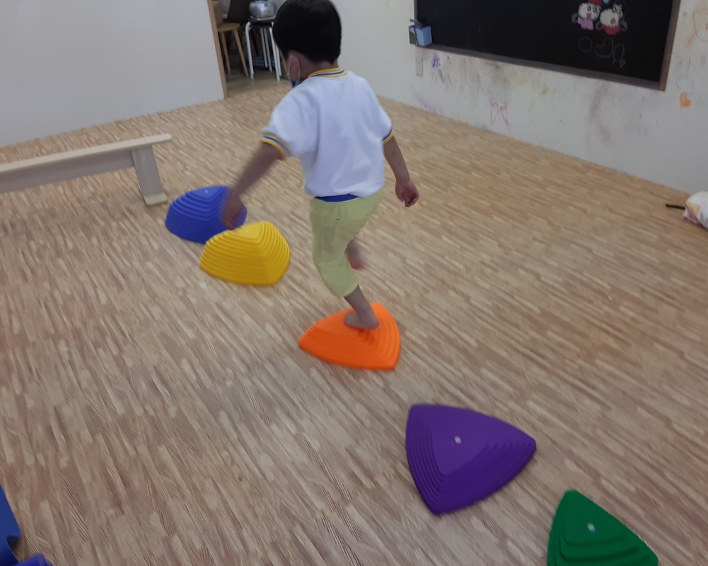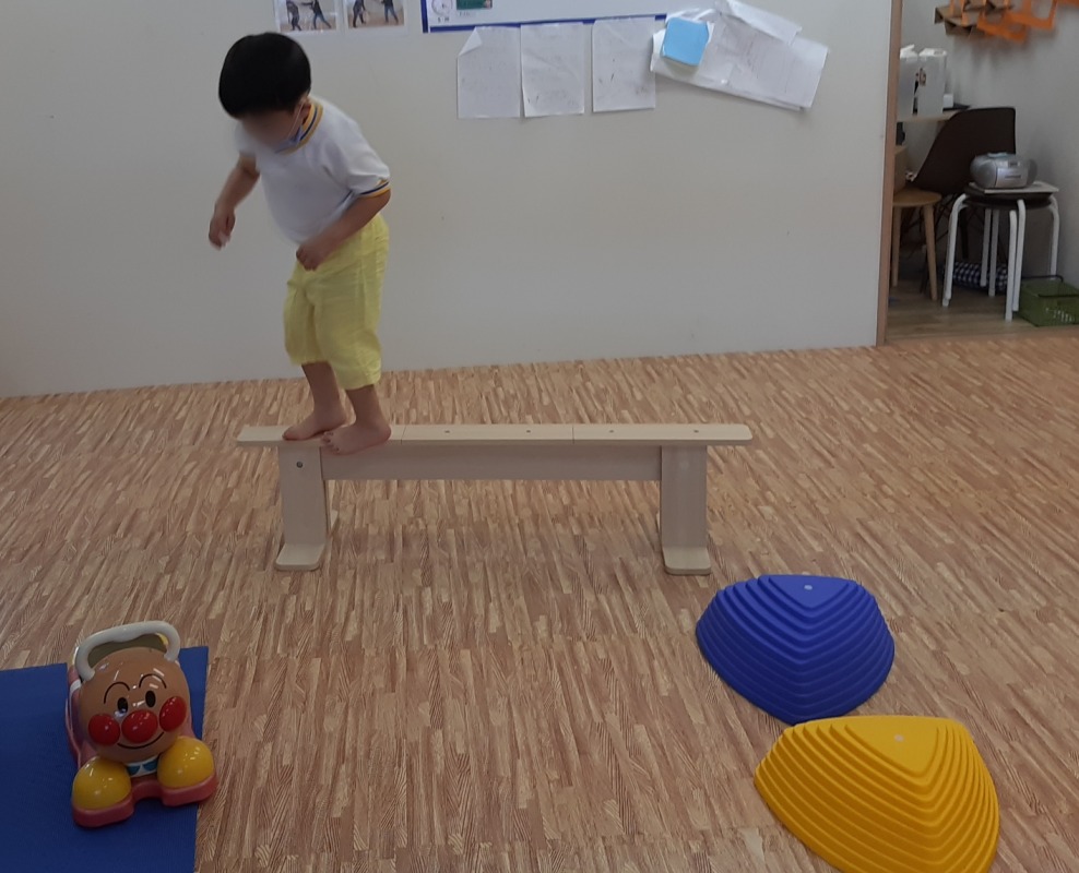 2021.5.20 サーキットあそび 日々のこと バランスストーンや平均台を並べてサーキットあそびをしました。もちろん考えたのも並べたのも子どもたちです。上手に渡れるかな?平均台を慎重に渡ります。僕も挑戦!まだまだサーキットは続きます。サーキットの中にケンケンパも組み入れていました。きまりました!自由にあそびながら、しらずしらずのうちに身体の使い方を学んでいきます。