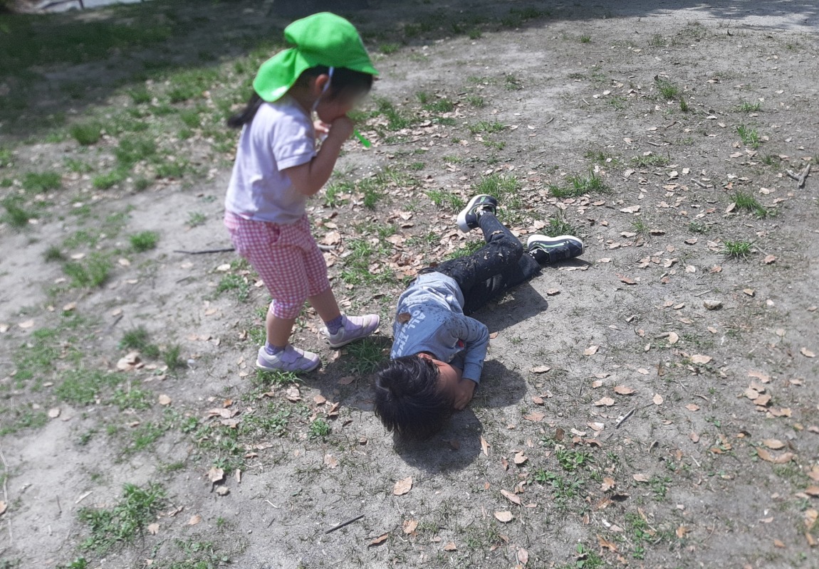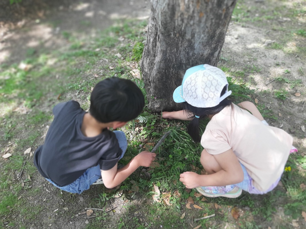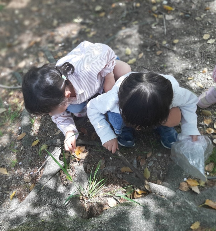 落ち葉であそんだり、ゴロゴロ転がったり、アリさんやダンゴムシさんを見つけたり。