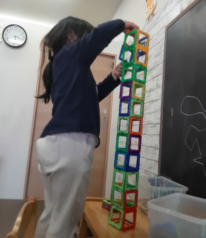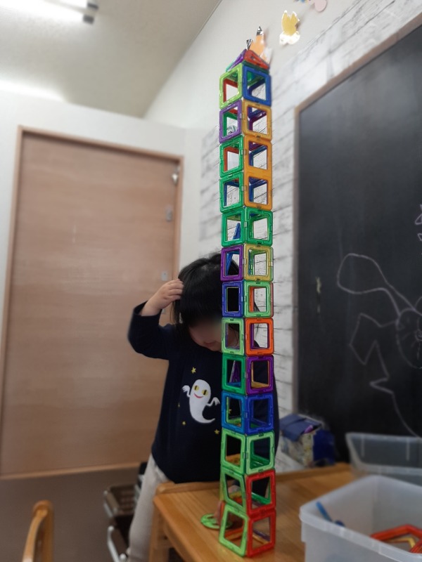 2025.4.23 たかーく積み上げたよ! 日々のこと こんなに高く積み上げました!見て見てー!とっても嬉しそう。がんばって挑戦して、達成できた時のこどもの笑顔は本当に輝いています。たくさんの成功体験を積み重ねて、自信を付けていきながら、「生きる力」を育んでいきます。