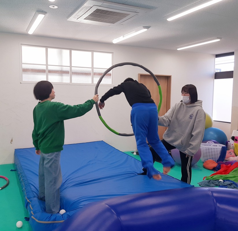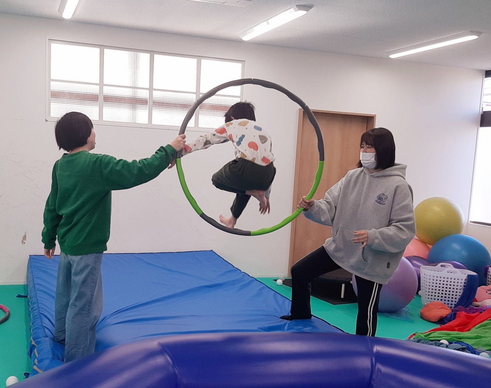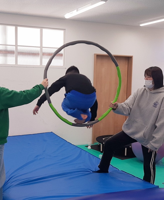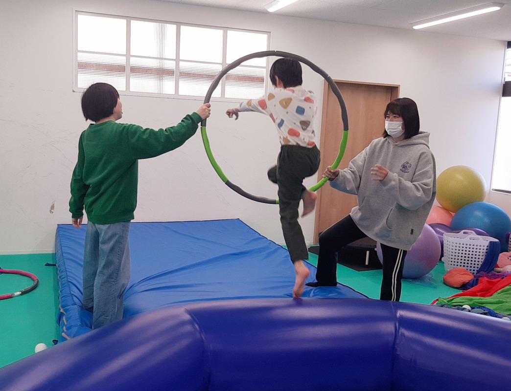 2025.5.23 輪っかの中をくぐり抜けよう 日々のこと ジャンプして輪っかの中をくぐり抜けます!失敗しても、何度も何度も挑戦。カメラを向けると尚更はりきる子どもたち!あそびの中での成功体験が、どれだけ大切か、きのねの子どもたちは教えてくれています。