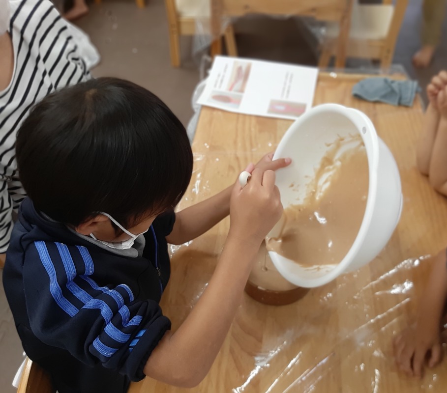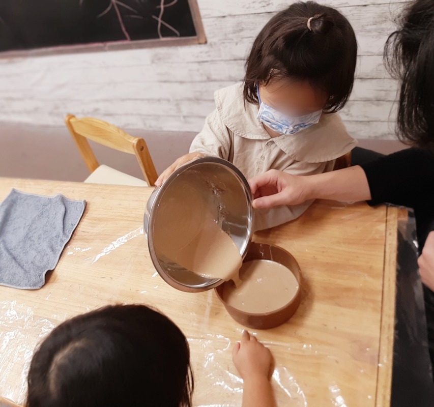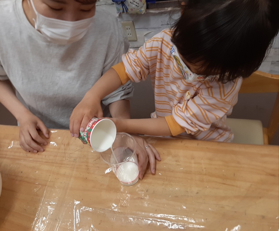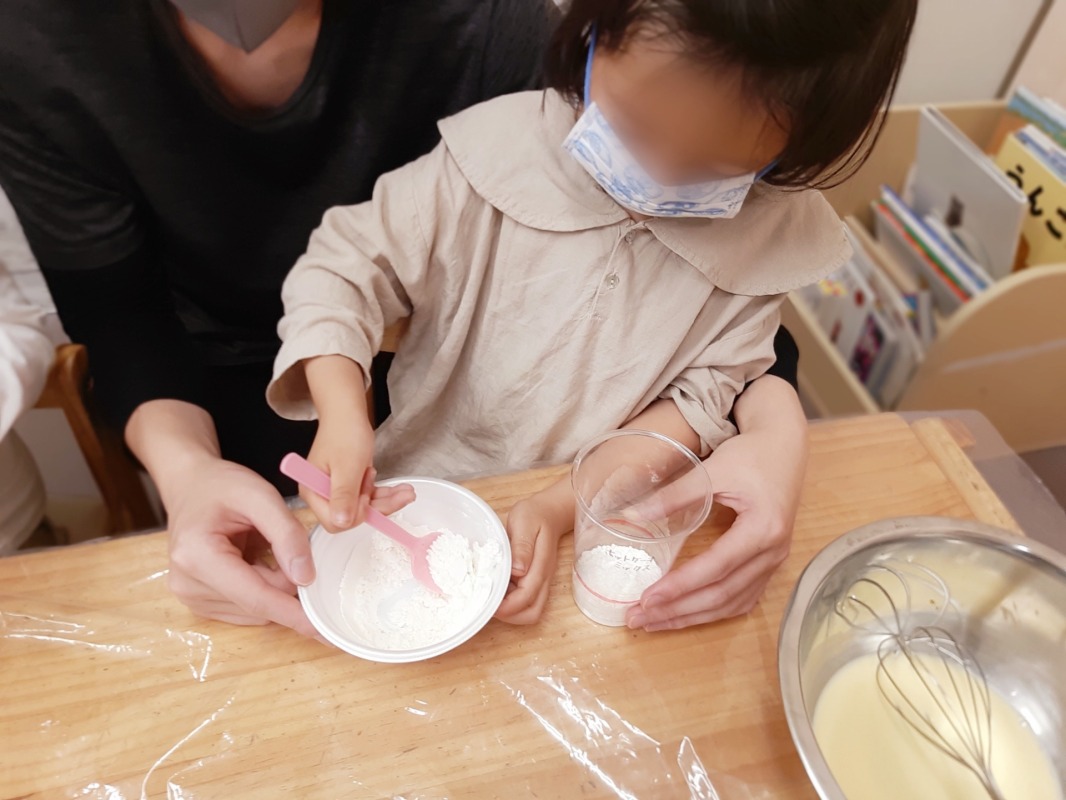しっかりとコップに書いてある線を見て、力加減をうまく調節しながら粉を入れることができました。