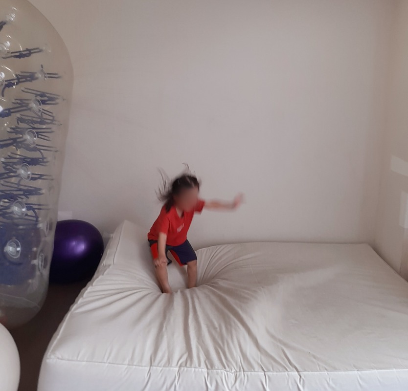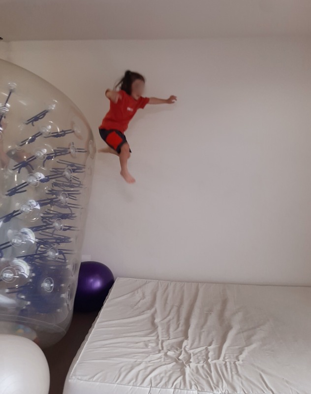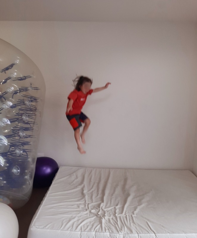 2025.6.26 高いところからジャンプしよう ! 日々のこと マットへ向かって思いっきりジャンプ!キマッてるでしょ?きのねなら、高いところから思いっきりジャンプできます。子どもが高いところからジャンプしたがるのは、それが発達に必要だから。発達に必要なあそびを、安全に思いきり楽しめるよう、環境を整えています。