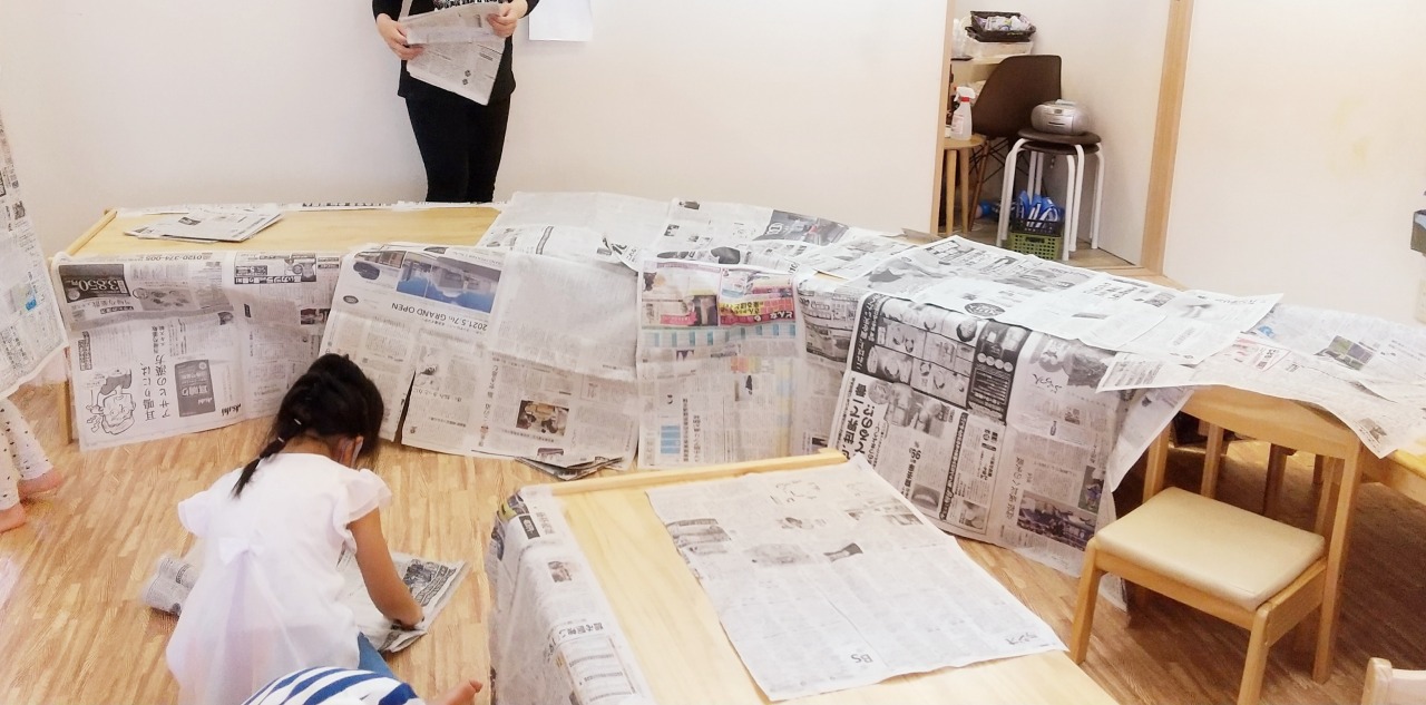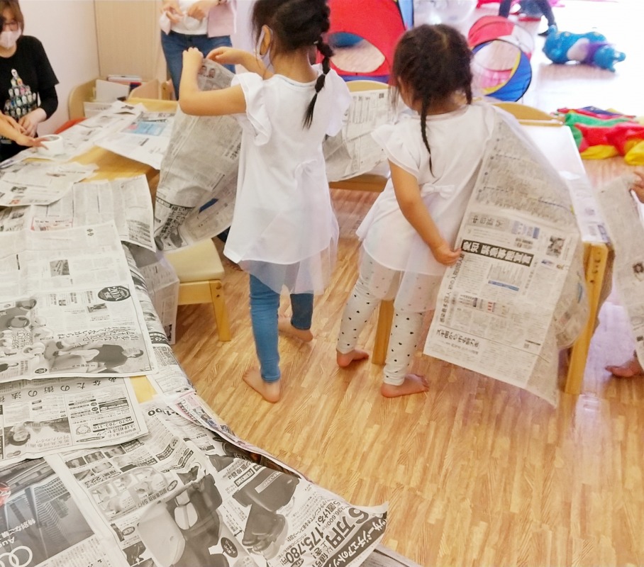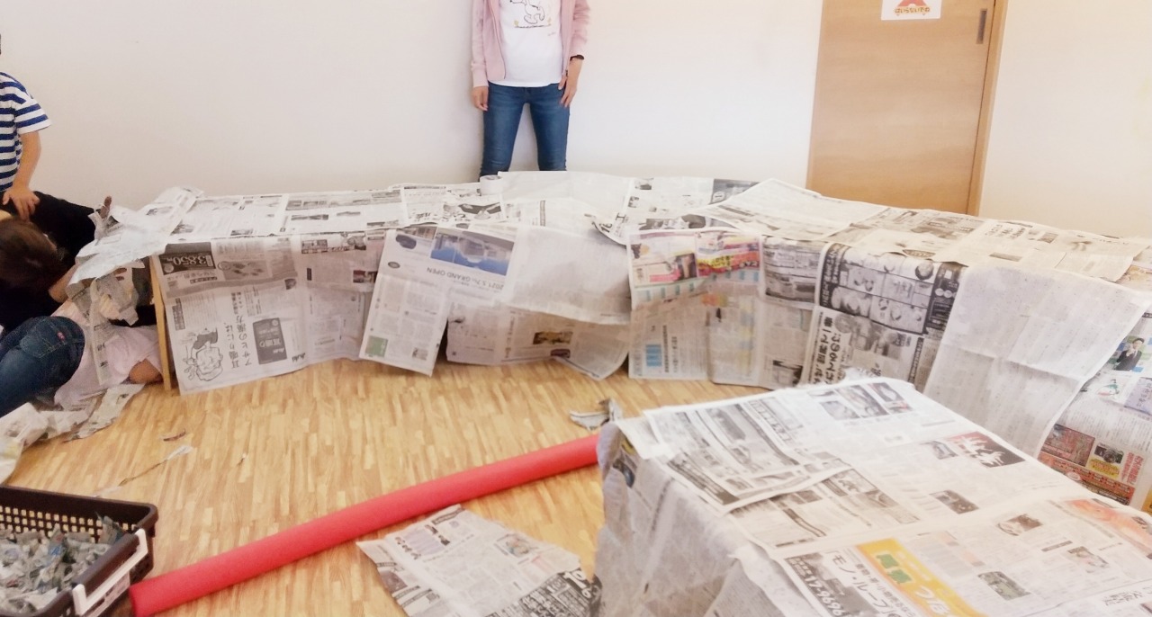 2021.5.23 新聞あそび 日々のこと 小幡緑地の後には新聞あそびをしました。やぶったり、衣装を作ったり、自由に楽しみました。スタッフとの共同作業です。何ができるのかな?新聞紙で作った迷路ができあがりました!いつもと違う景色にみんな大興奮。喜んで中に入っていましたよ。