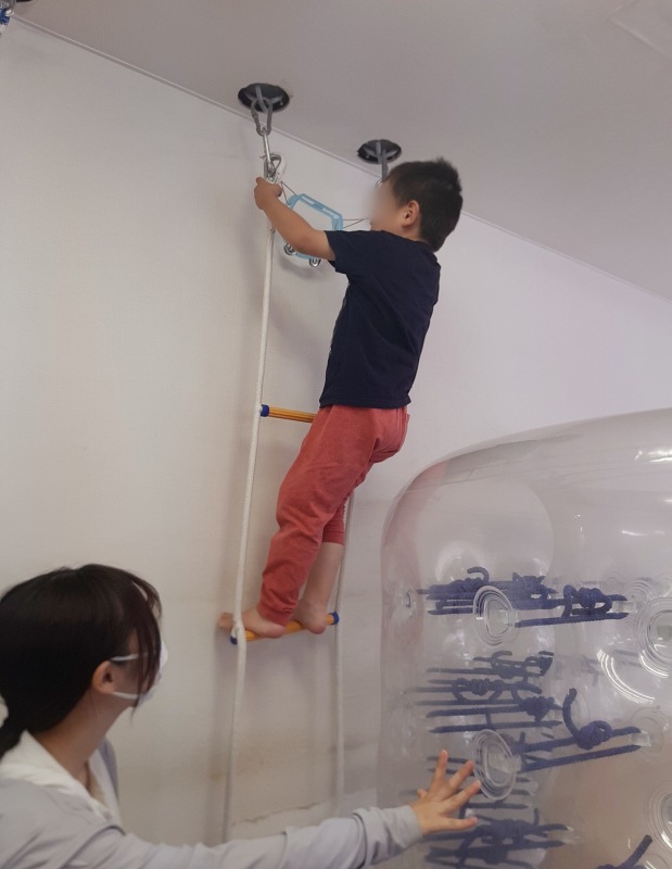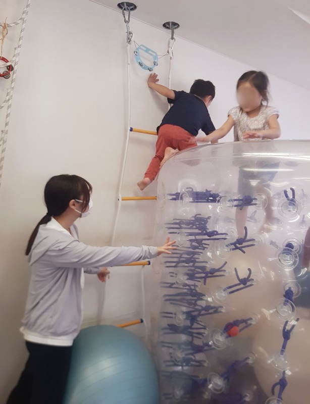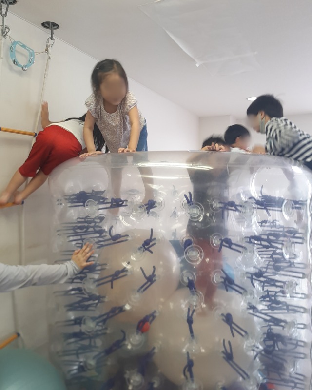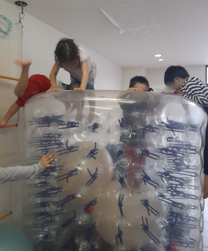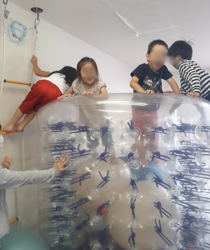 2025.7.7 サイバーホイール☆トランポリン 日々のこと 縦にしたサイバーホイールに、バランスボールやクライミングラダーを使って登っていきます。サイバーホイールの中にはバランスボールが敷き詰められていて、落ちないようになっています。中のバランスボールで思いきりジャンプ!たくさん弾んで、発達な必要な、前庭覚や固有覚にアプローチ。まるで大型トランポリンのよう!子どもたちの笑顔も輝きます。