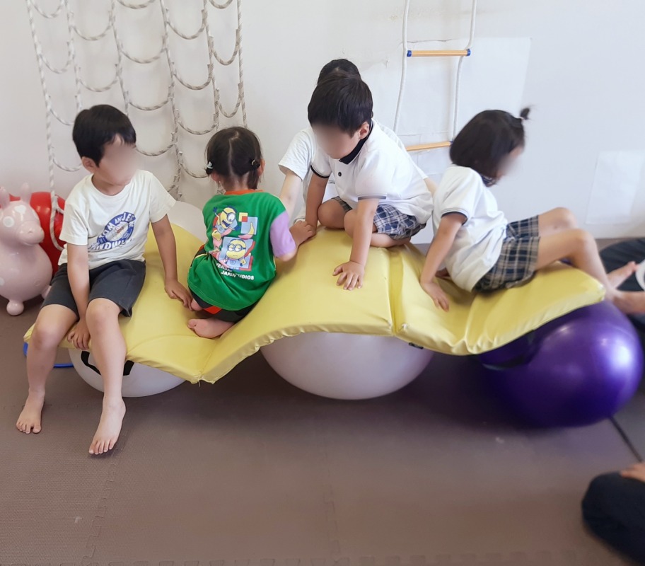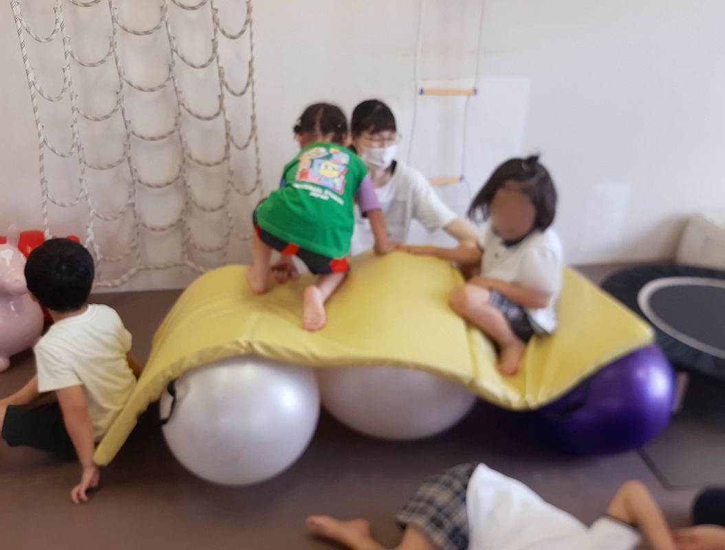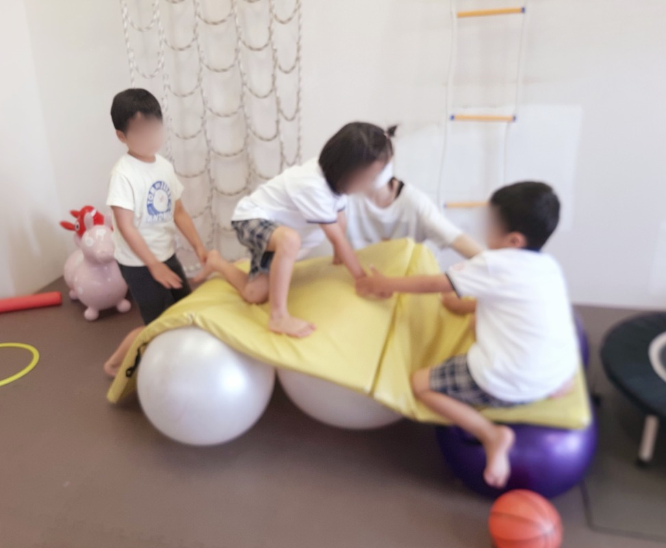 2025.8.6 みんなで乗れるかな? 日々のこと みんなでグラグラ揺れるマットに登ってみよう!お友だち同士で助け合う姿にほっこり。落ちちゃうのも楽しいね!無事みんなで乗れました!友だちと楽しくあそびながら、発達に必要な感覚刺激を取り入れ、共感性も育てていきます。
