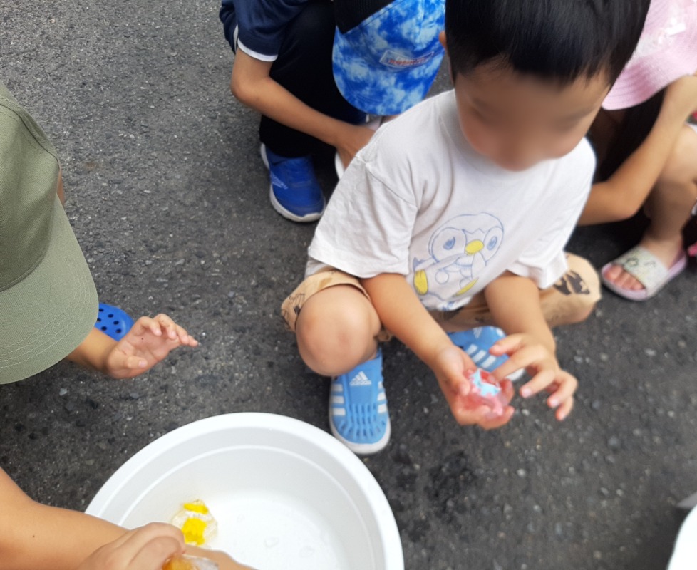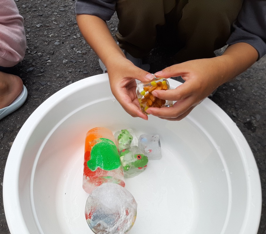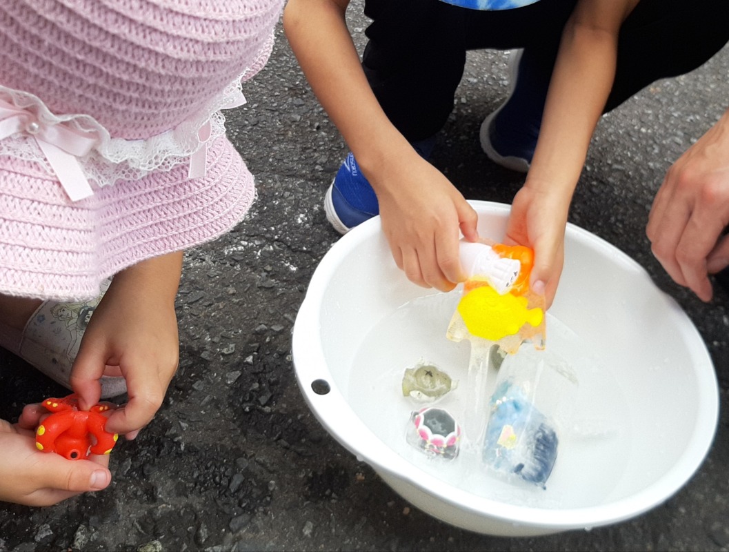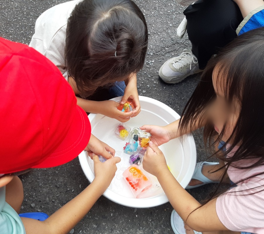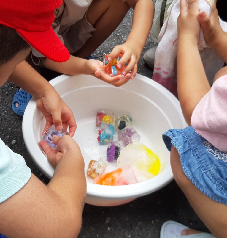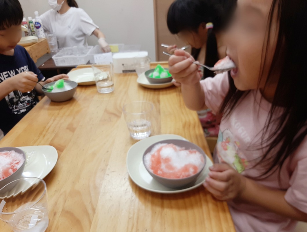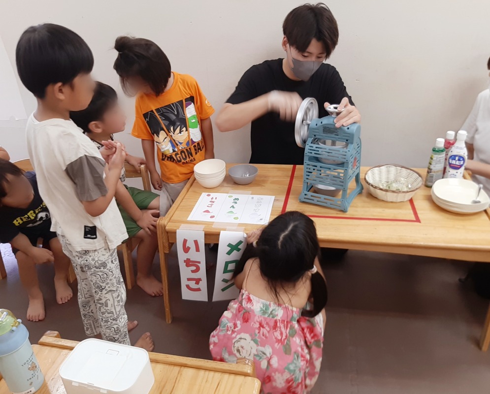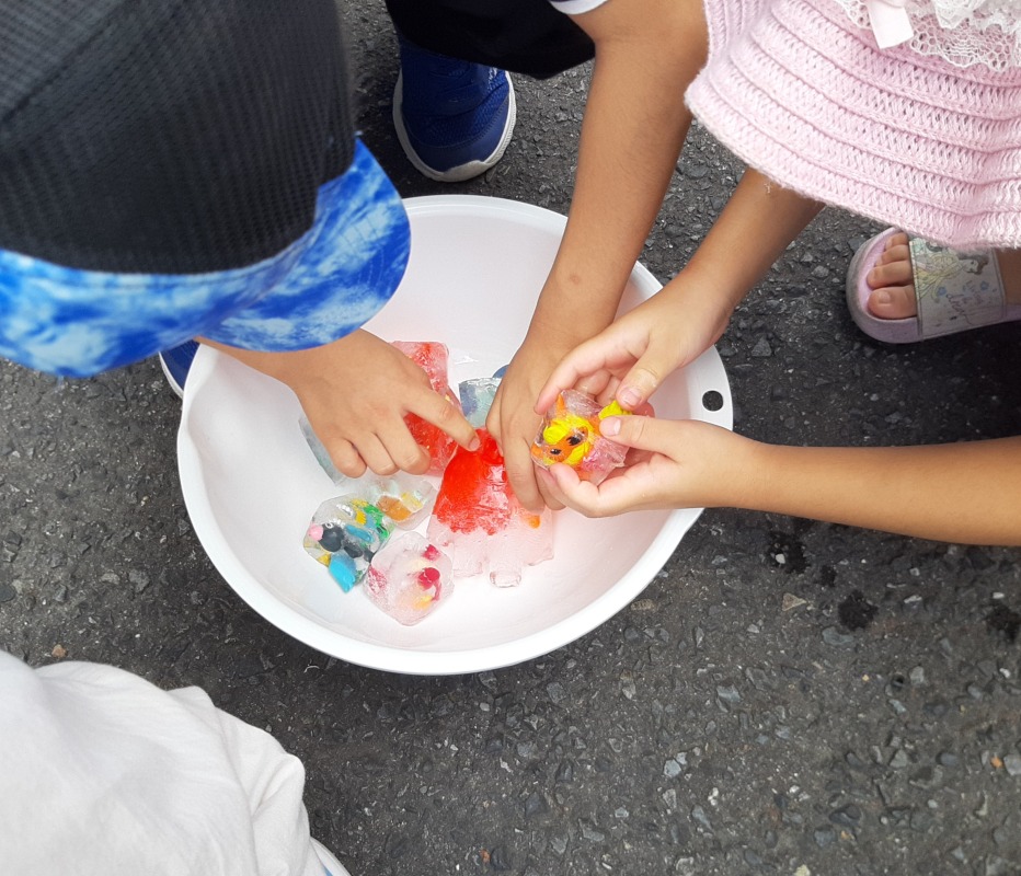 2025.7.21 氷あそびとかき氷やさん 日々のこと 祝日の今日、きのねでは、氷あそびを楽しみました。氷の中に入ったおもちゃをみんなで取り出します。冷たくて気持ちいいね!発達にとってとても大切な触覚を、しっかり使っていきます。午後からは、きのねにかき氷やさんがやってきました!冷たくておいしいね!カラフルな氷あそびと、みんな大好きかき氷で、楽しい夏の一日になったかな?