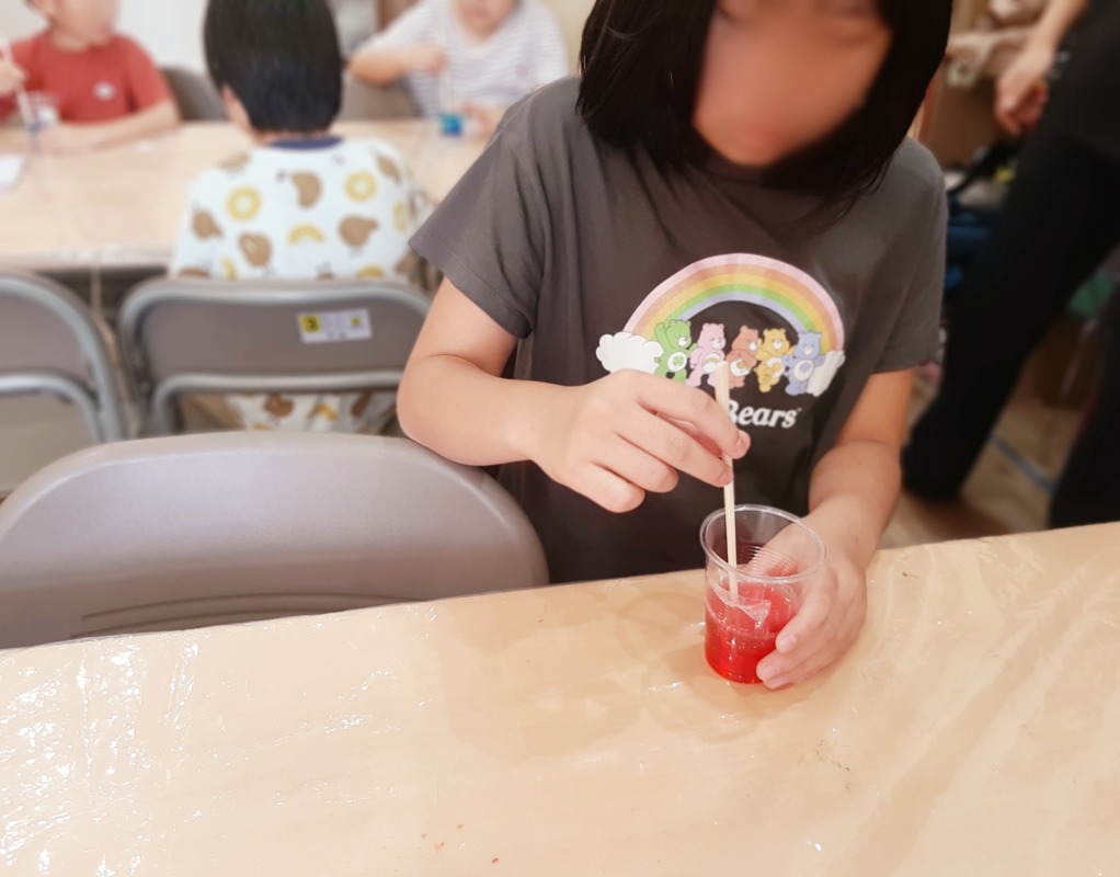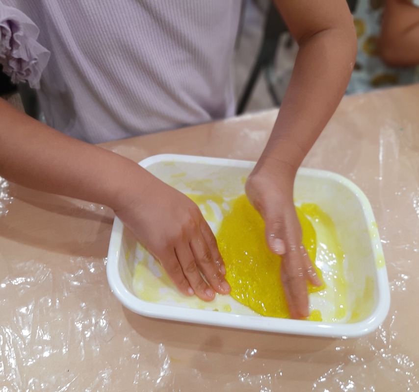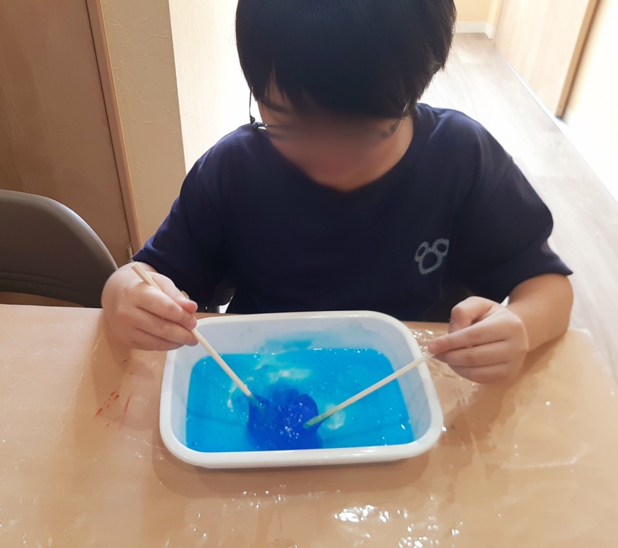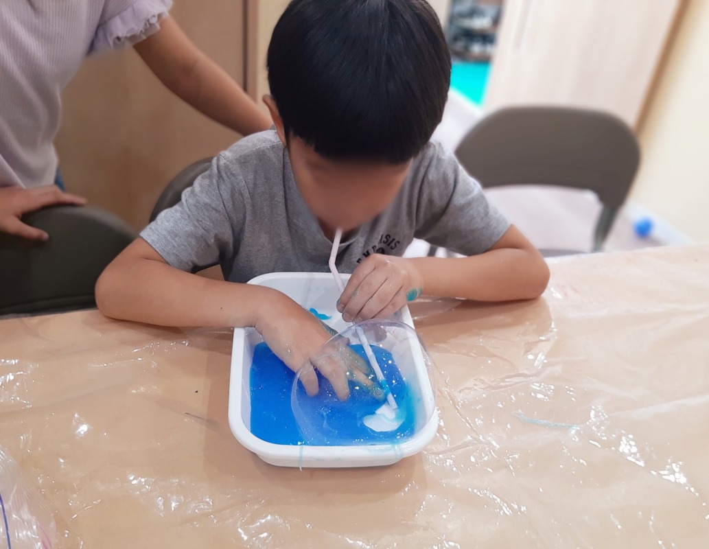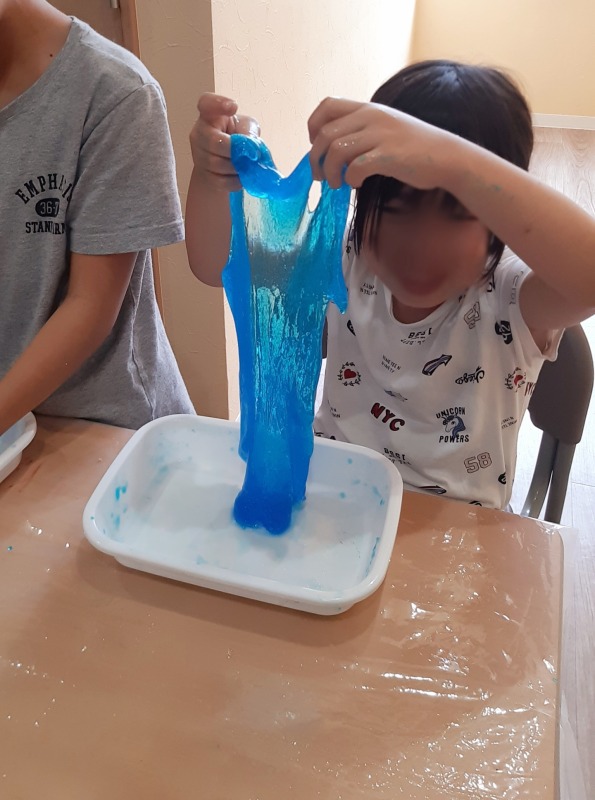 2025.8.11 ironoha ジェル粘土づくり 日々のこと ironohaの先週土曜日のイベントは、ジェル粘土づくり!よーく混ぜて…固まるかな?固まってきた!不思議な感触だね!洗濯のりを入れたらもっと伸びるかな?水を入れたらもっと柔らかくなるかな?いろいろ考えて、実験みたいにして楽しみました!ストローで吹くと風船ができましたよ。あそび方に決まりはありません。ルールは守りながら、自分たちのやり方で、思い思いに楽しみました。