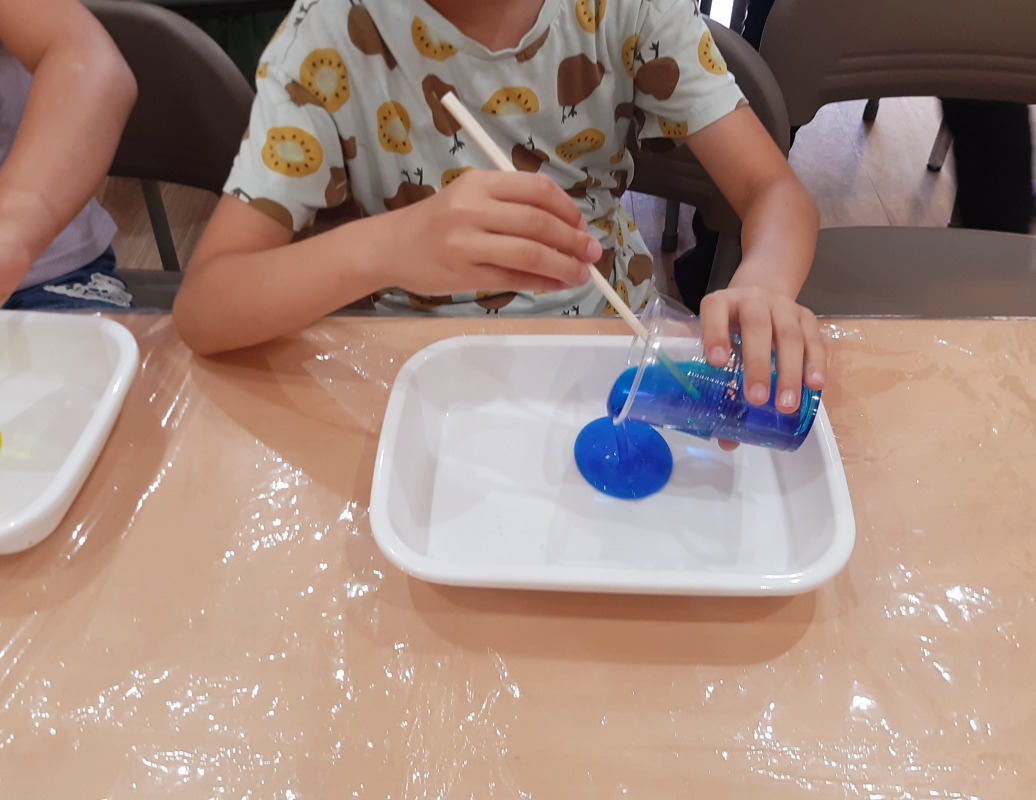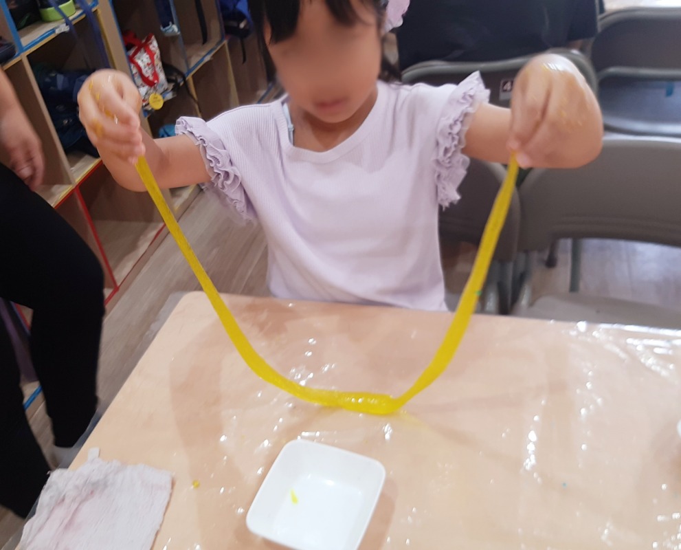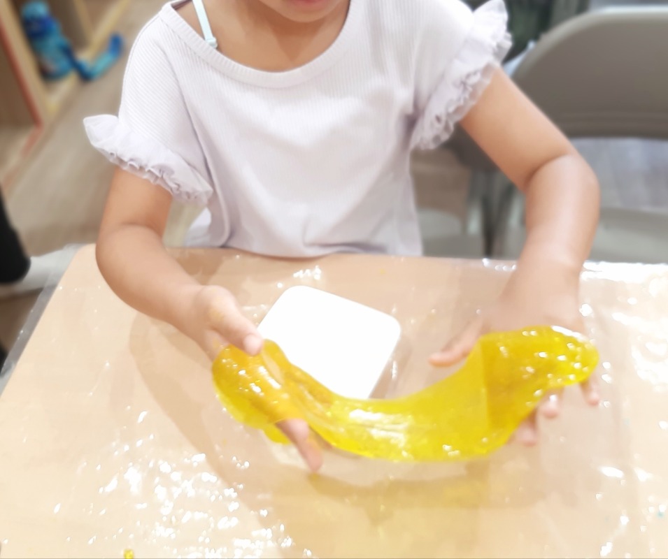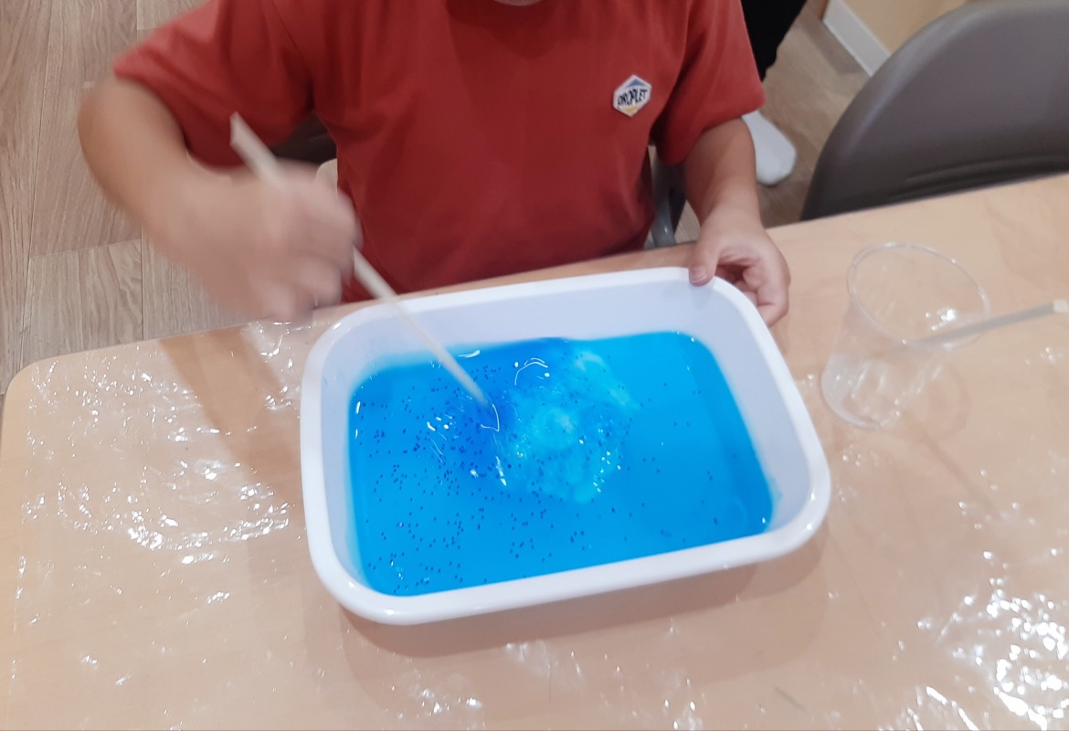 2025.8.11 ironoha ジェル粘土づくり 日々のこと ironohaの先週土曜日のイベントは、ジェル粘土づくり!よーく混ぜて…固まるかな?固まってきた!不思議な感触だね!洗濯のりを入れたらもっと伸びるかな?水を入れたらもっと柔らかくなるかな?いろいろ考えて、実験みたいにして楽しみました!ストローで吹くと風船ができましたよ。あそび方に決まりはありません。ルールは守りながら、自分たちのやり方で、思い思いに楽しみました。