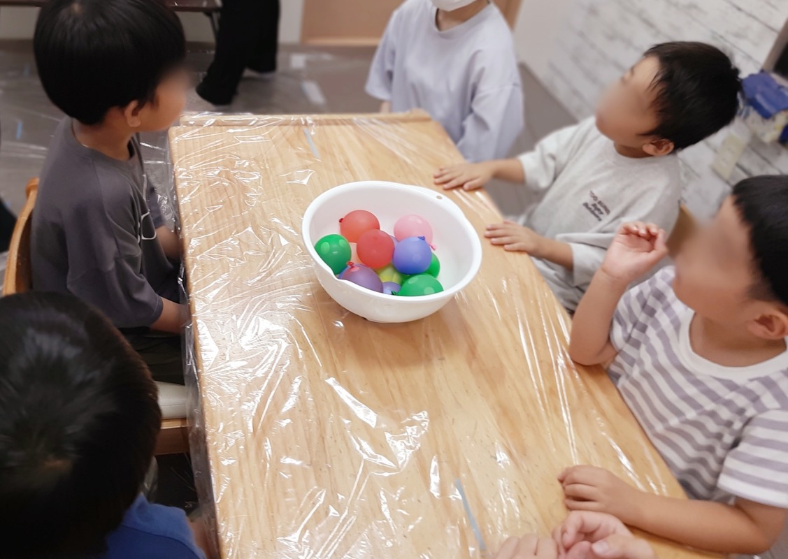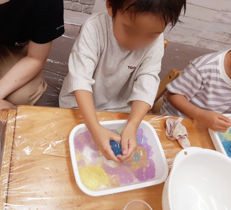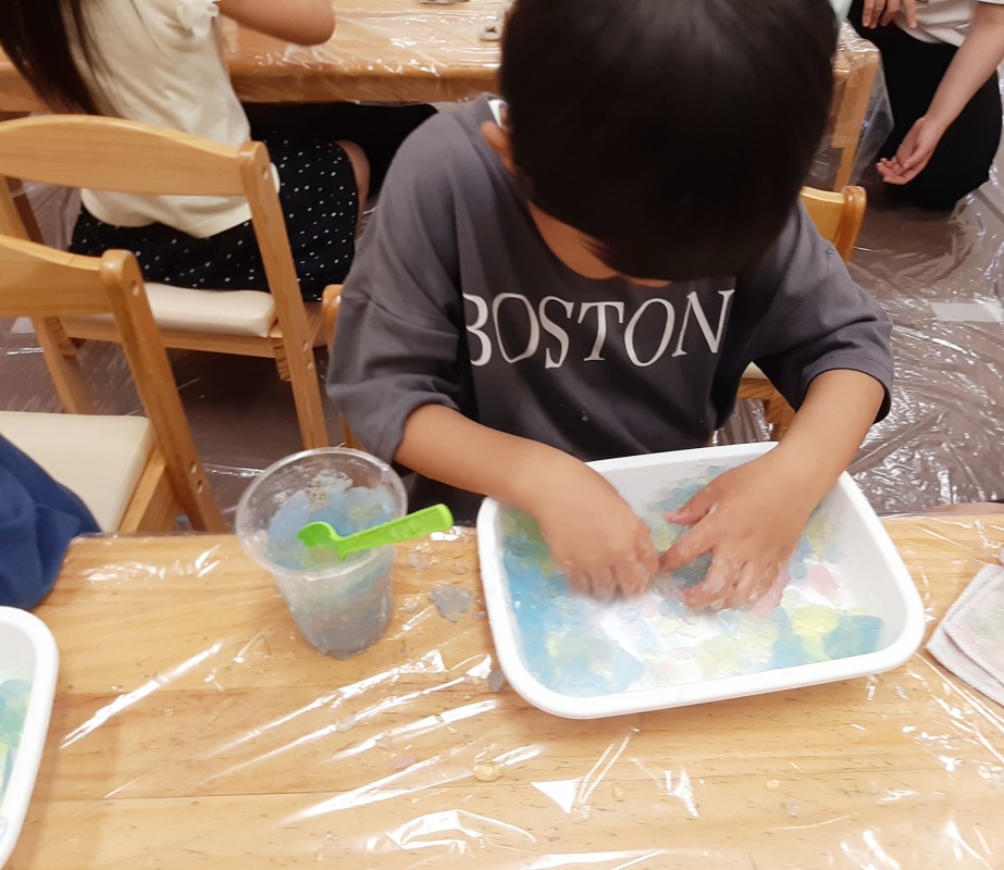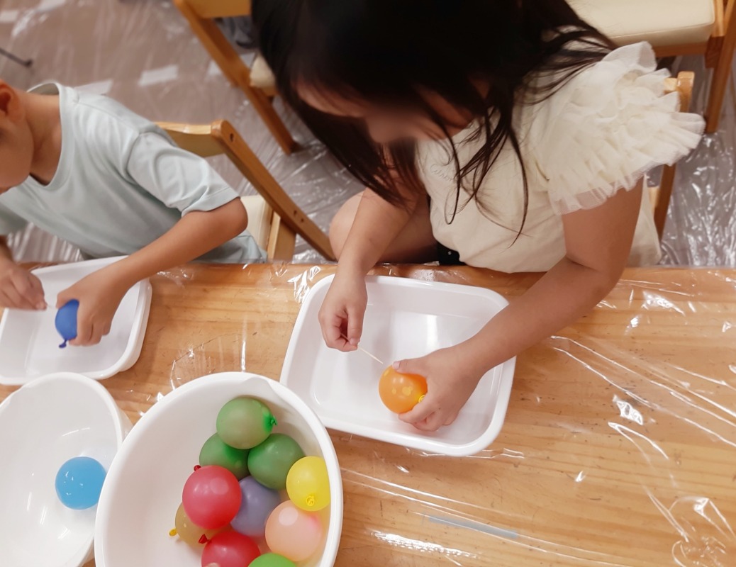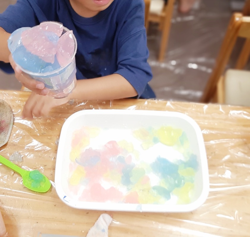 2025.8.12 きのね 風船寒天あそび 日々のこと きのねで毎回好評な寒天あそび。今回は、水風船の中に入れてみました!さあ、どんな寒天が出てくるかな?爪楊枝で差すと、プルンとカラフルな寒天が出てきました!ヒンヤリ摘めたくて気持ちいいね。つぶしたり、集めたり、カップに入れたりして、いろんな感触を味わいながら、思い思いに楽しみました。