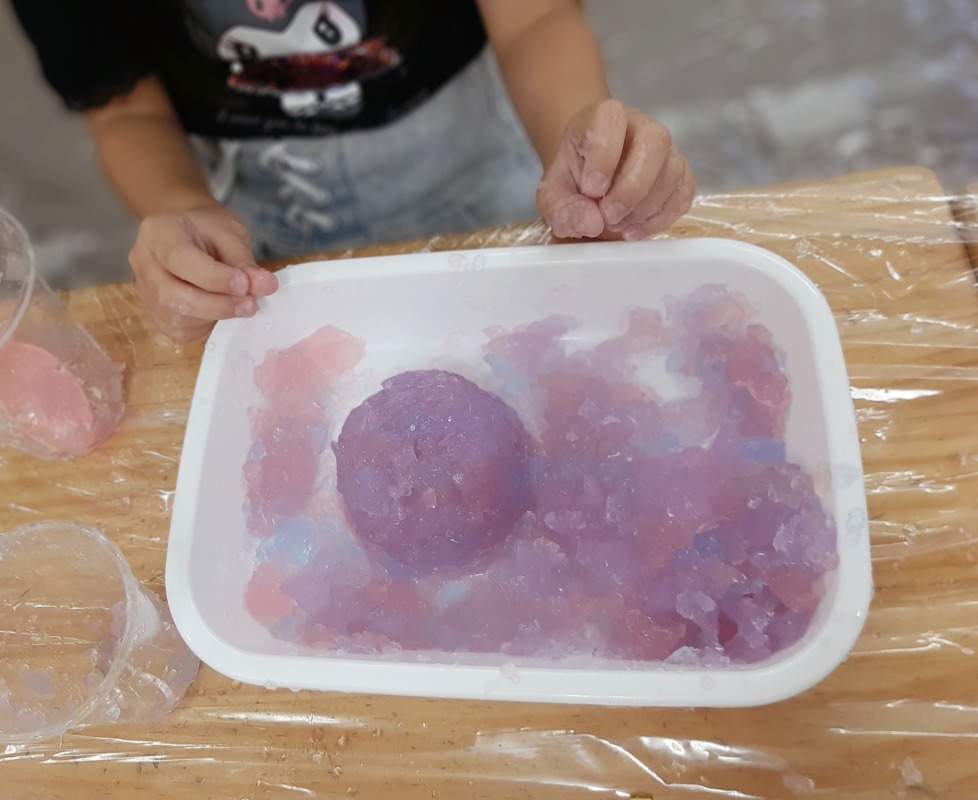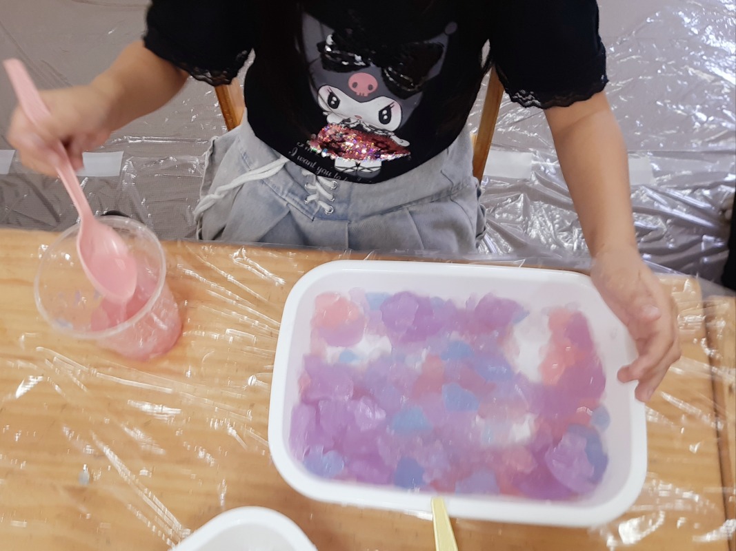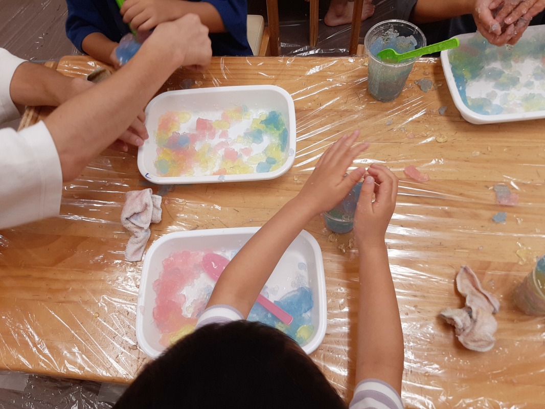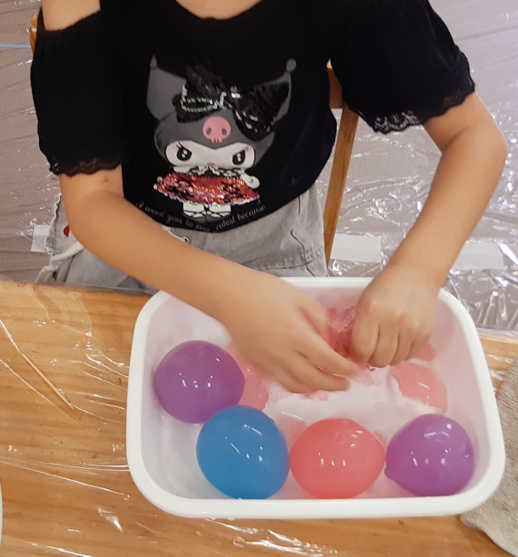 2025.8.12 きのね 風船寒天あそび 日々のこと きのねで毎回好評な寒天あそび。今回は、水風船の中に入れてみました!さあ、どんな寒天が出てくるかな?爪楊枝で差すと、プルンとカラフルな寒天が出てきました!ヒンヤリ摘めたくて気持ちいいね。つぶしたり、集めたり、カップに入れたりして、いろんな感触を味わいながら、思い思いに楽しみました。