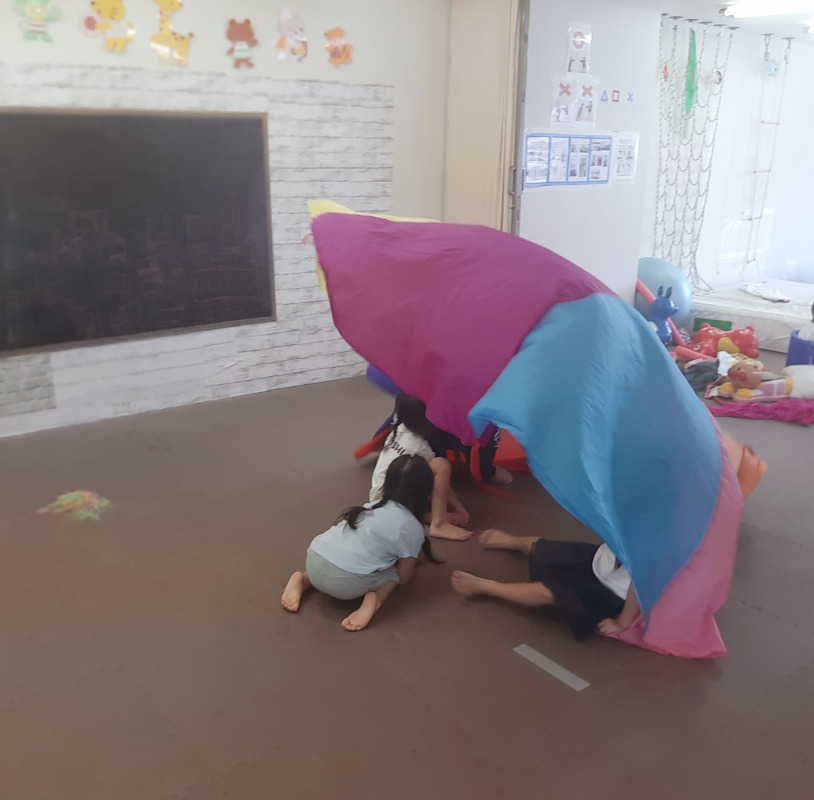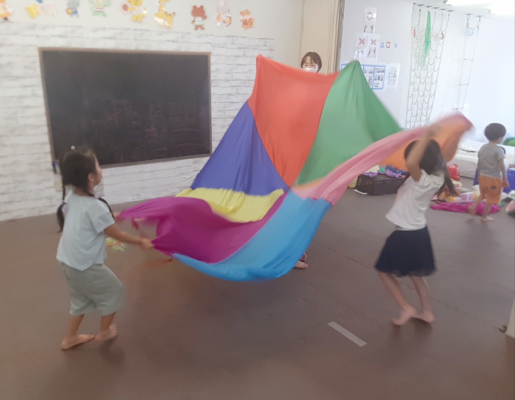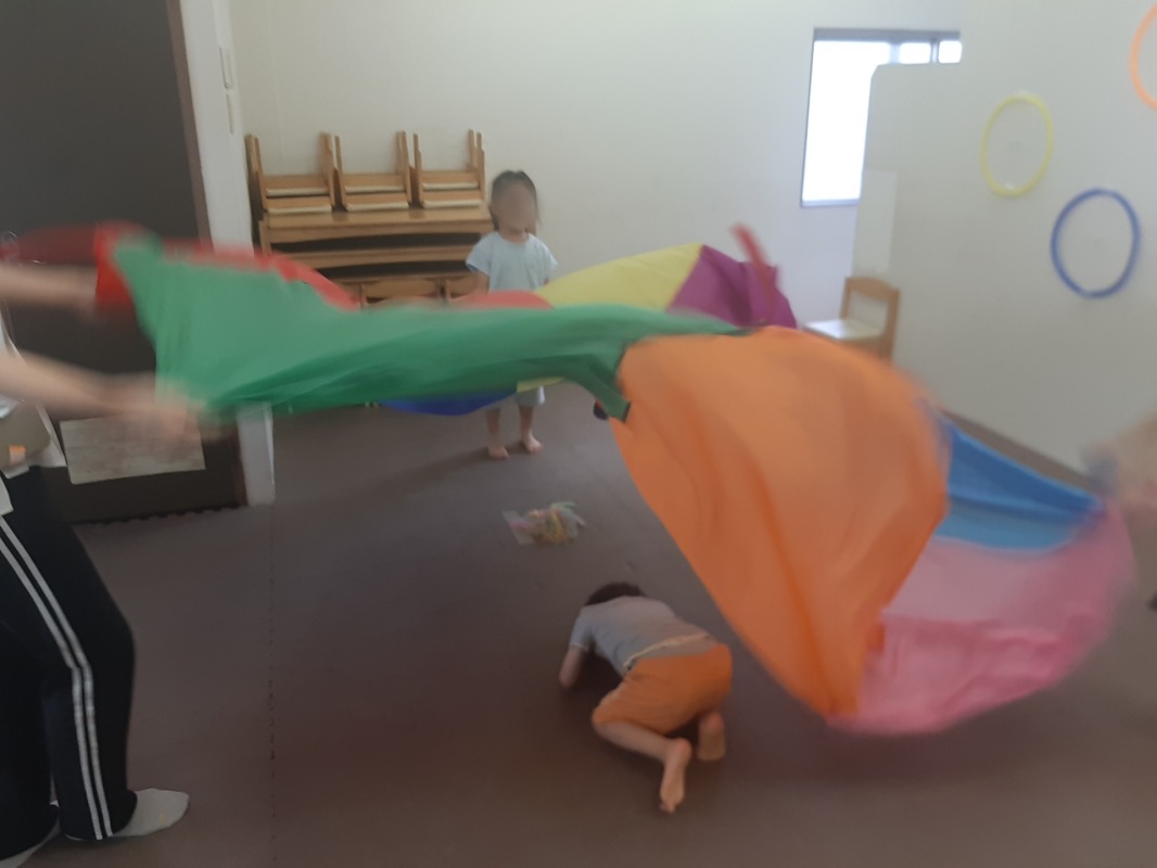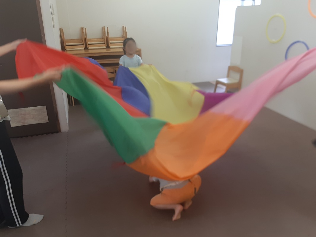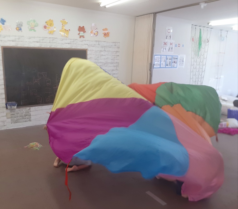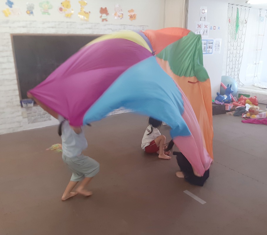 2025.11.3 パラバルーンの中で 日々のこと みんなで息を合わせて3、2、1…うまく入れたね。パラバルーンの中はどんな世界かな?こんなあそびも楽しいね!決められた動きをするのではなく、そこにある物と、環境の中であそびを発展させていく子どもたち。あそび方を自分たちで決めて、うまくいった時の笑顔は、本当に輝いています。