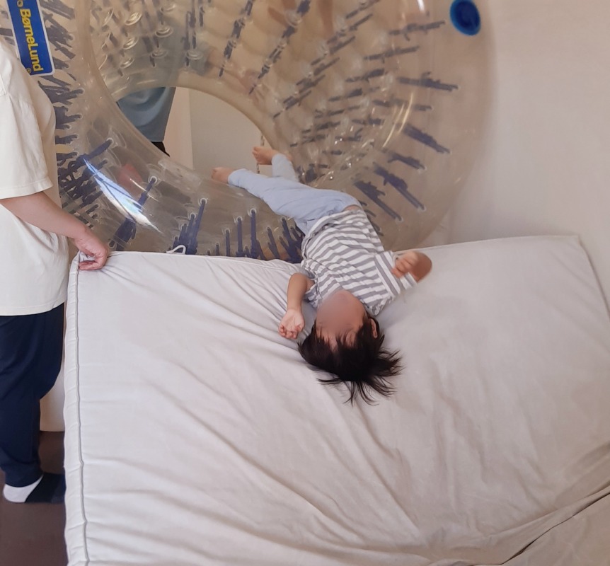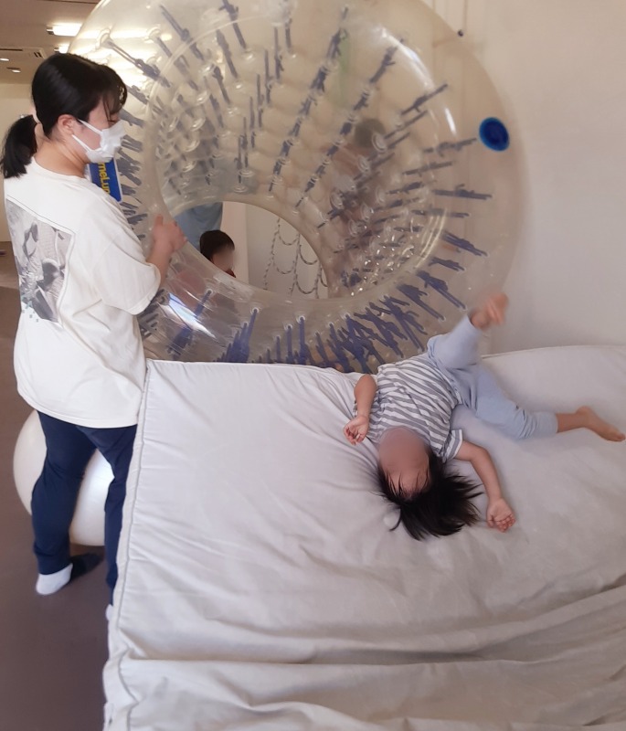 2025.11.25 サイバーホイールの中から 日々のこと サイバーホイール逆滑り台!きのねで生まれた、たくさんのあそび。いろんな遊具を組み合わせて、遊び方は無限大に広がります!全身を使って、様々な感覚情報を取り込んでいきます。お顔はニッコニコ!フワフワのマットも気持ちいいね!これからも、子どもたちと一緒に、たくさんのあそびを考え出していききたいです。