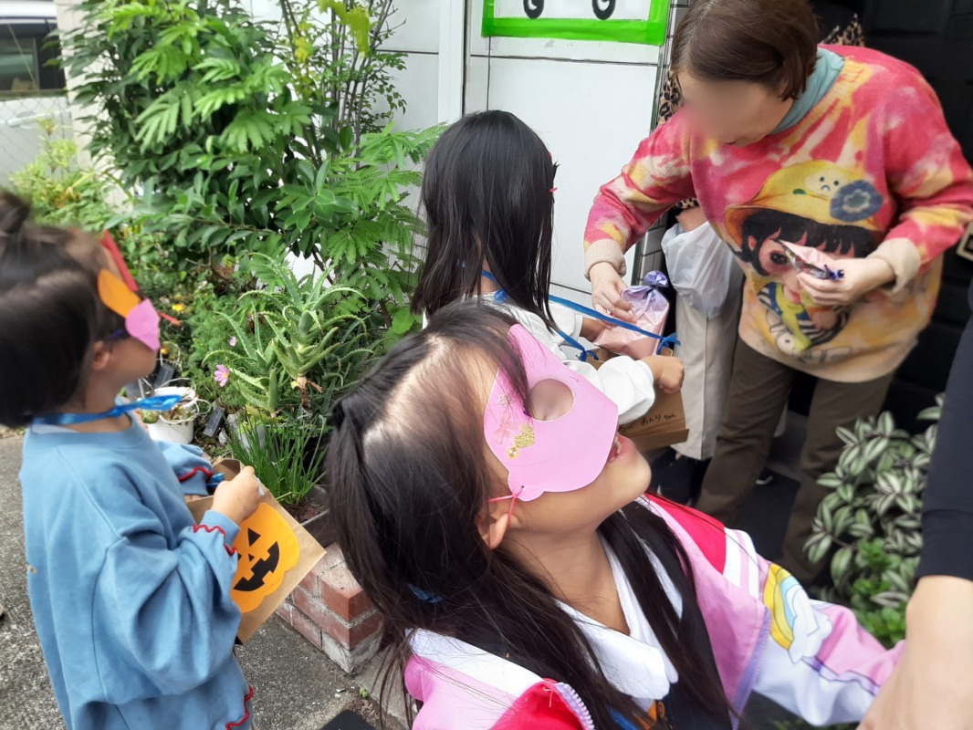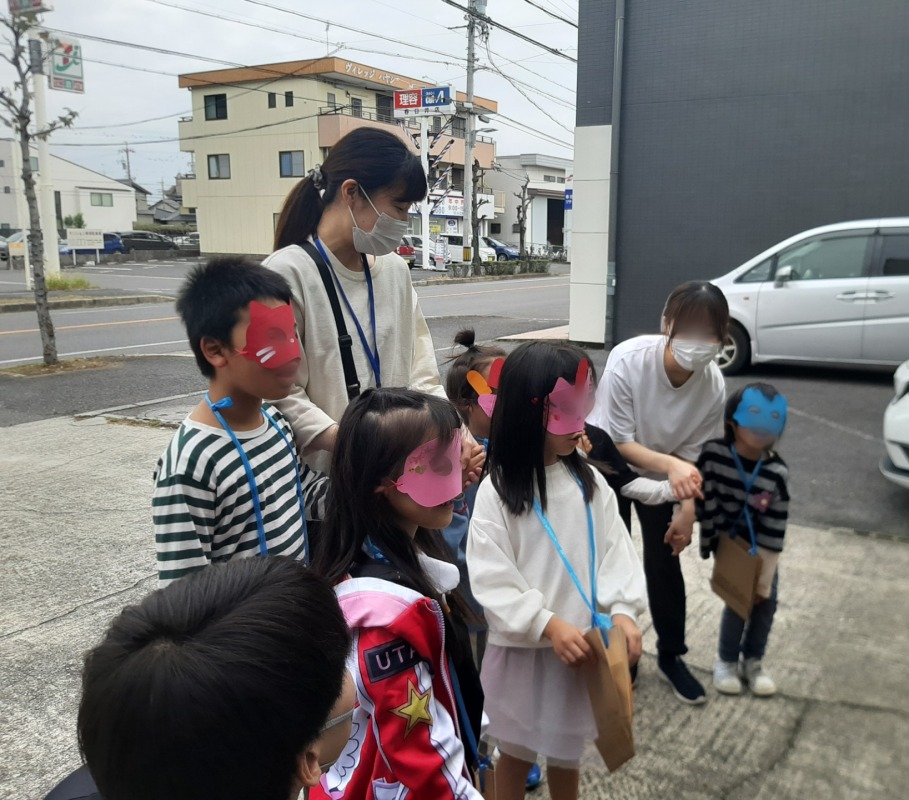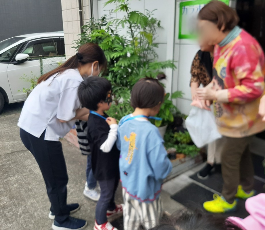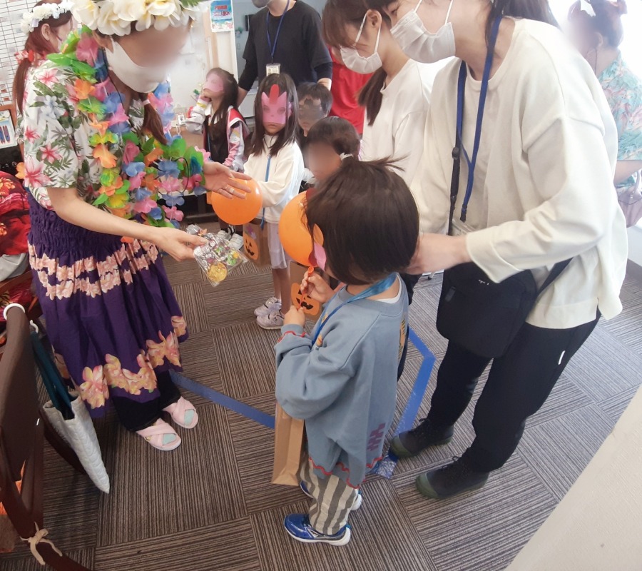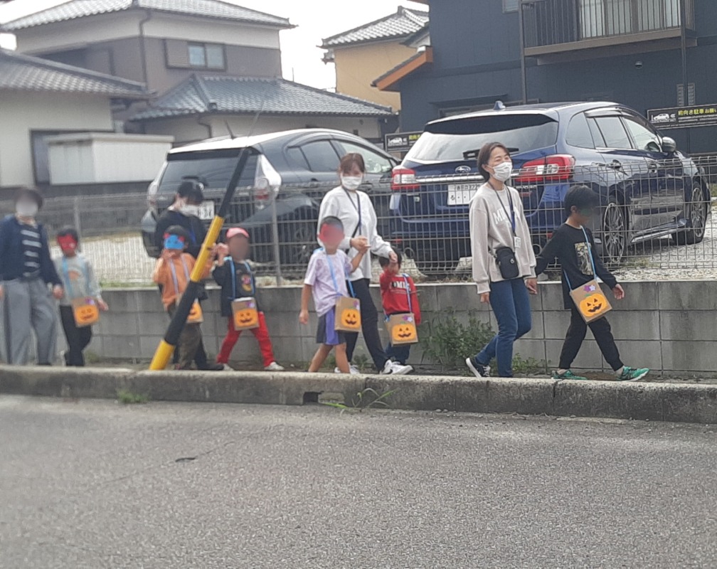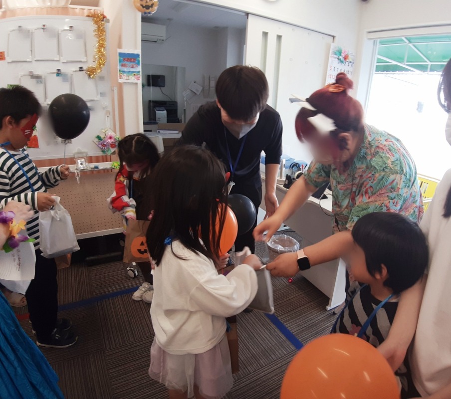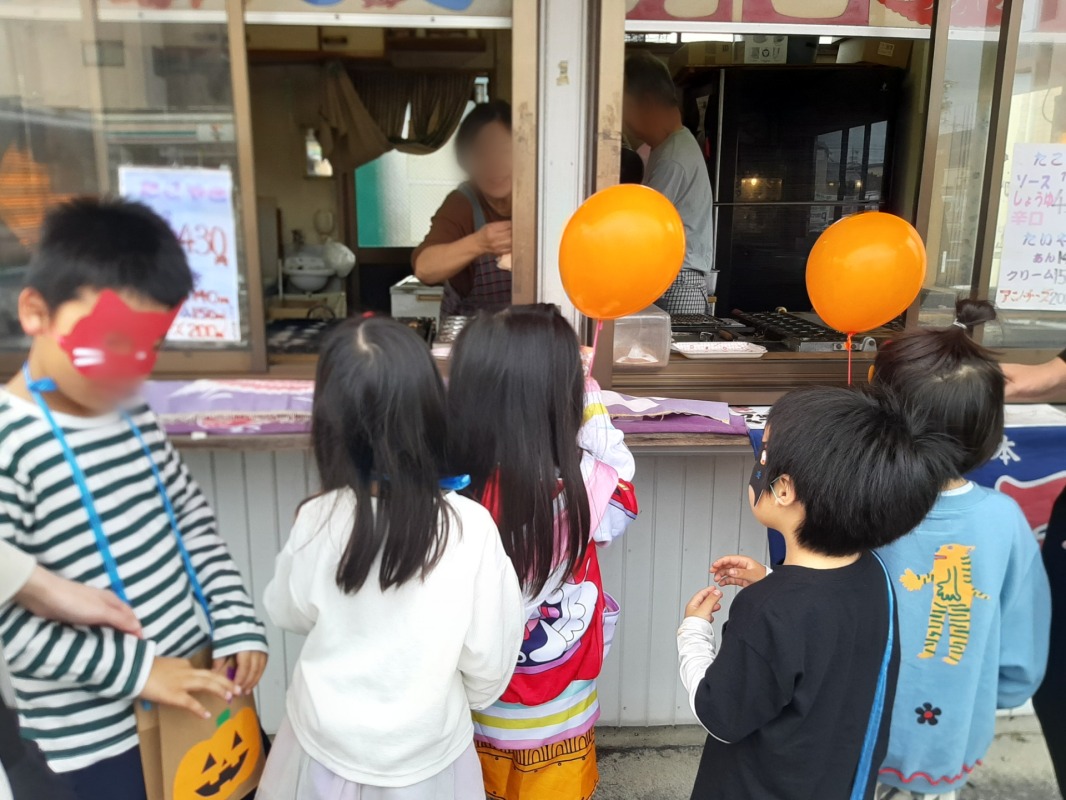 近所のお店や施設に予めお願いに行き、事前にお渡ししておいたお菓子を子どもたちに配ってもらいました。