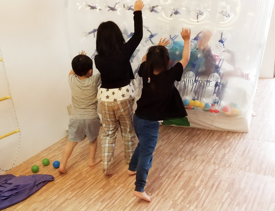 「次は私が押すね!」スタッフが介入しなくても、ちゃんと自分たちで考え、協力しあい、工夫しながらあそびを進めています。