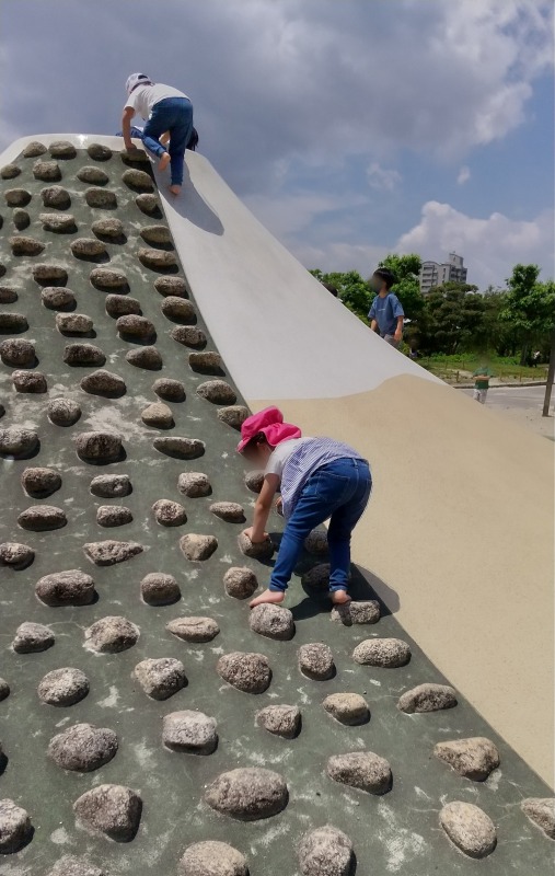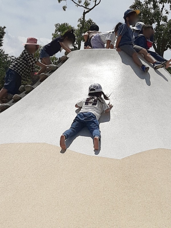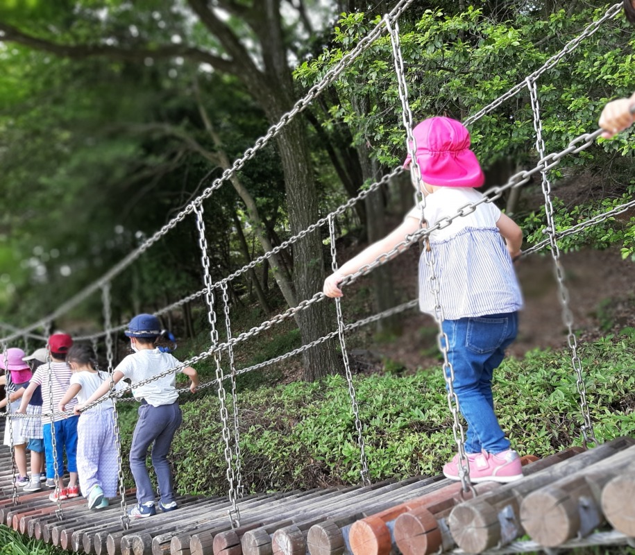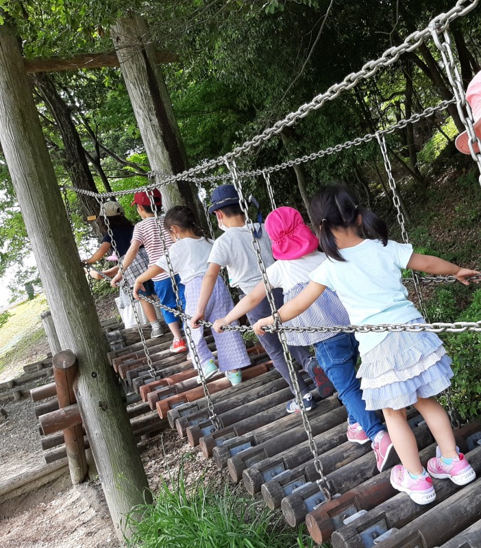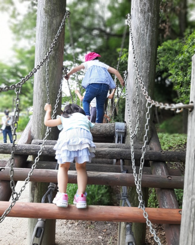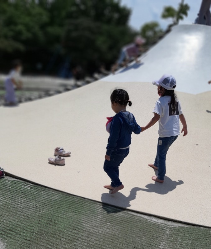 2021.5.29 桃花台中央公園 日々のこと 桃花台中央公園に行きました。みんな大好き斜面登り。滑り落ちるのも楽しい!裸足で歩くの気持ちいいね。少し奥のほうに行くと、吊り橋発見!慎重に慎重に…気付けばきのねの子たちでいっぱいになっていましたよ。