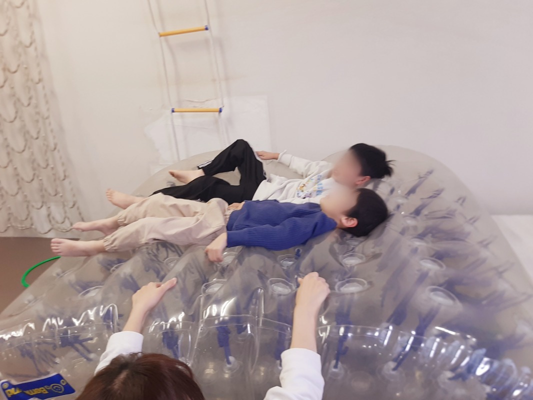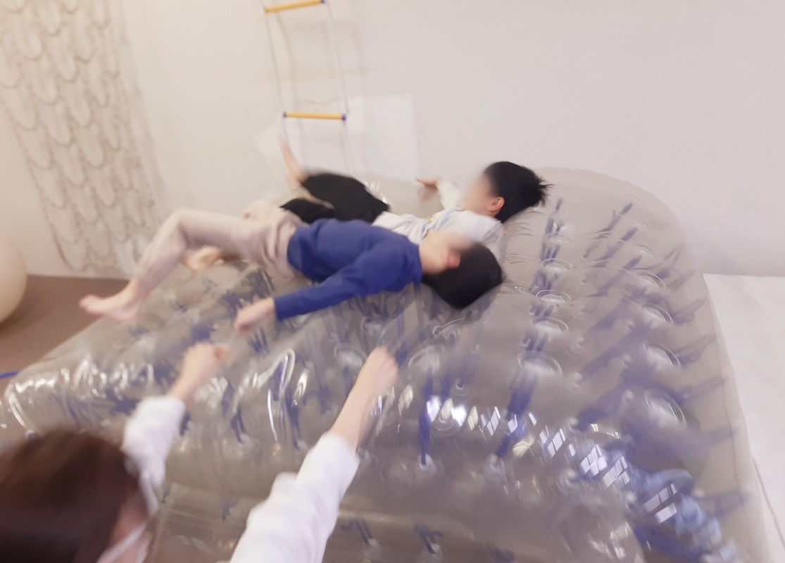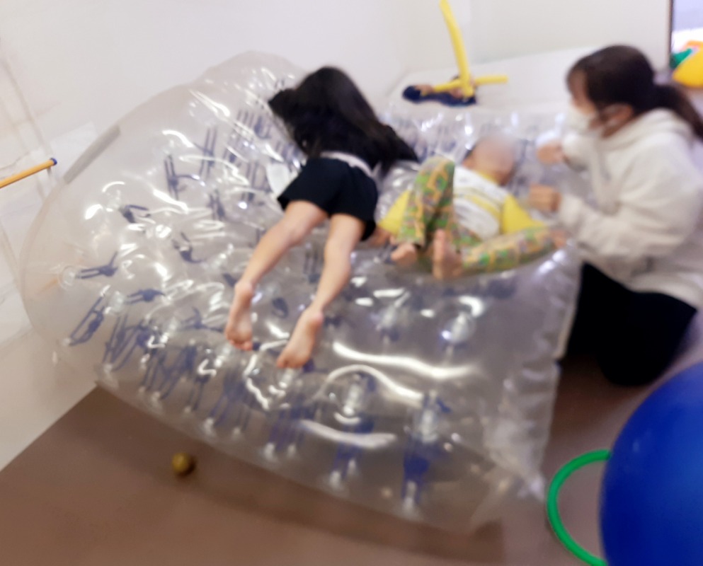 2026.2.7 ふわふわサイバーホイール 日々のこと 空気を半分ぐらい抜いたサイバーホイールに乗って…グラグラあそび!強い揺れ感覚を、しっかり脳に届けます。楽しくあそびながら、発達の土台づくりに必要の、「前庭覚」にアプローチしていきます。