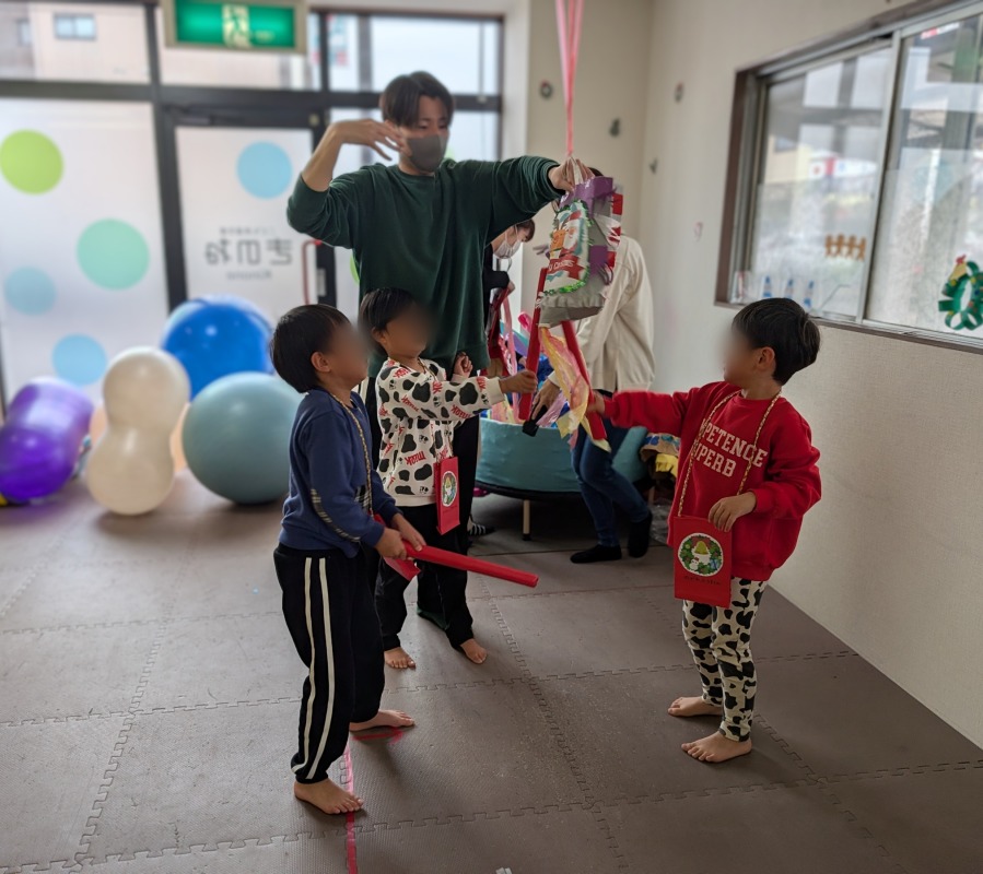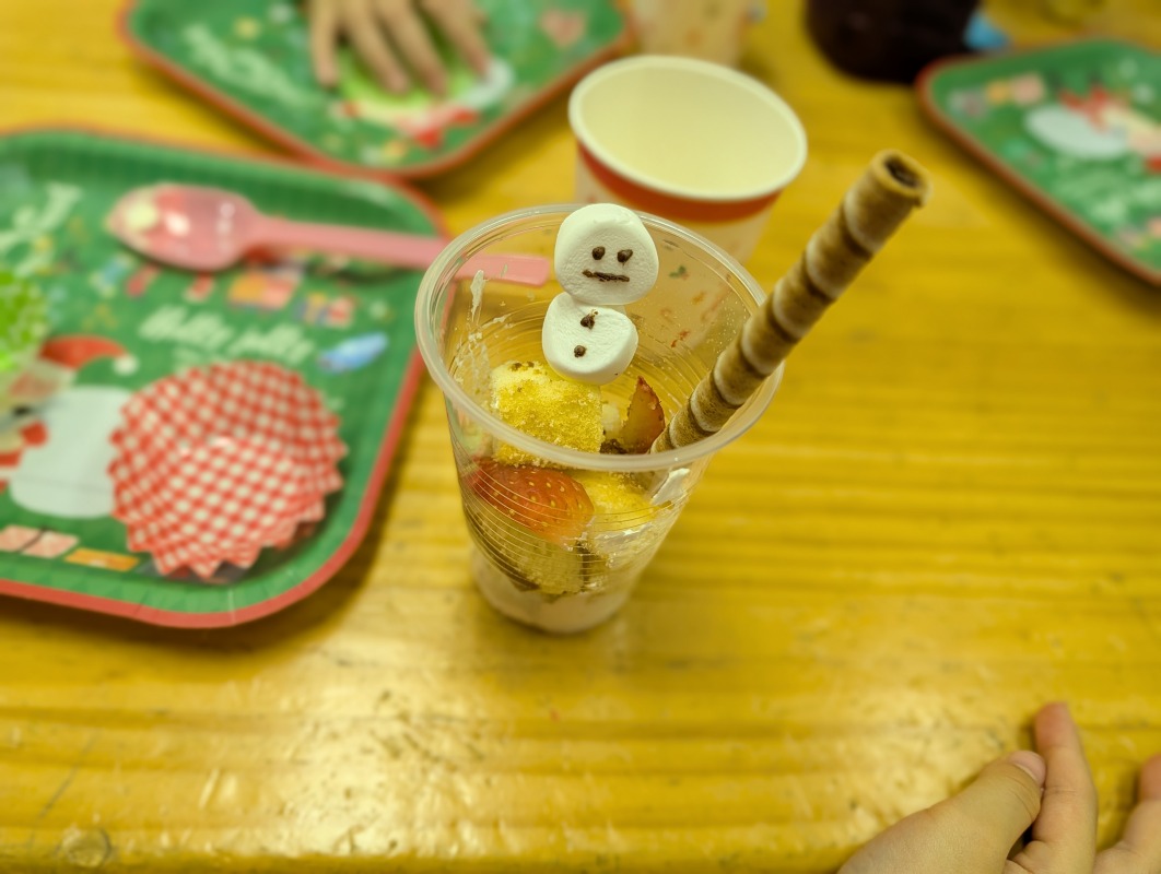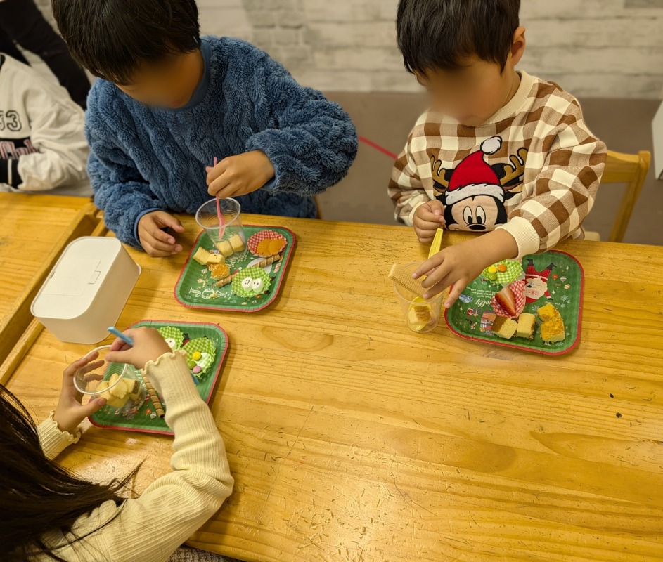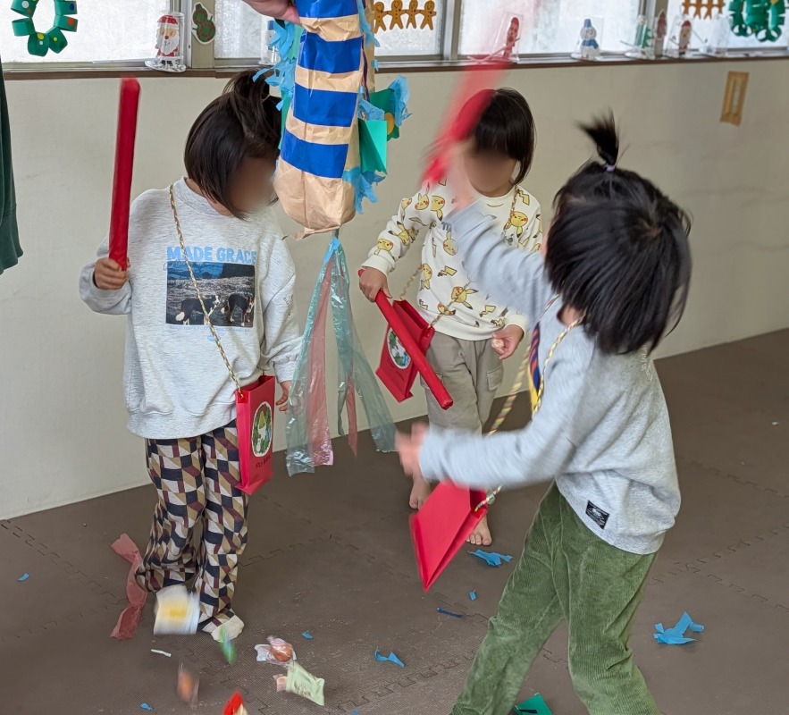 2025.12.21 きのね クリスマス会 日々のこと きのねのクリスマス会の様子です。素敵なクリスマスの飾りを作りました!毎年恒例のピニャータはやっぱり大盛りあがり!お菓子たくさんゲットできたかな?今年のクリスマスデザートは、パフェ作り!かわいくできたね。サンタさんからプレゼントももらって、大満足のきのねの子どもたちです!みんなニコニコ笑顔がはじけてましたよ。