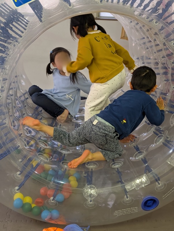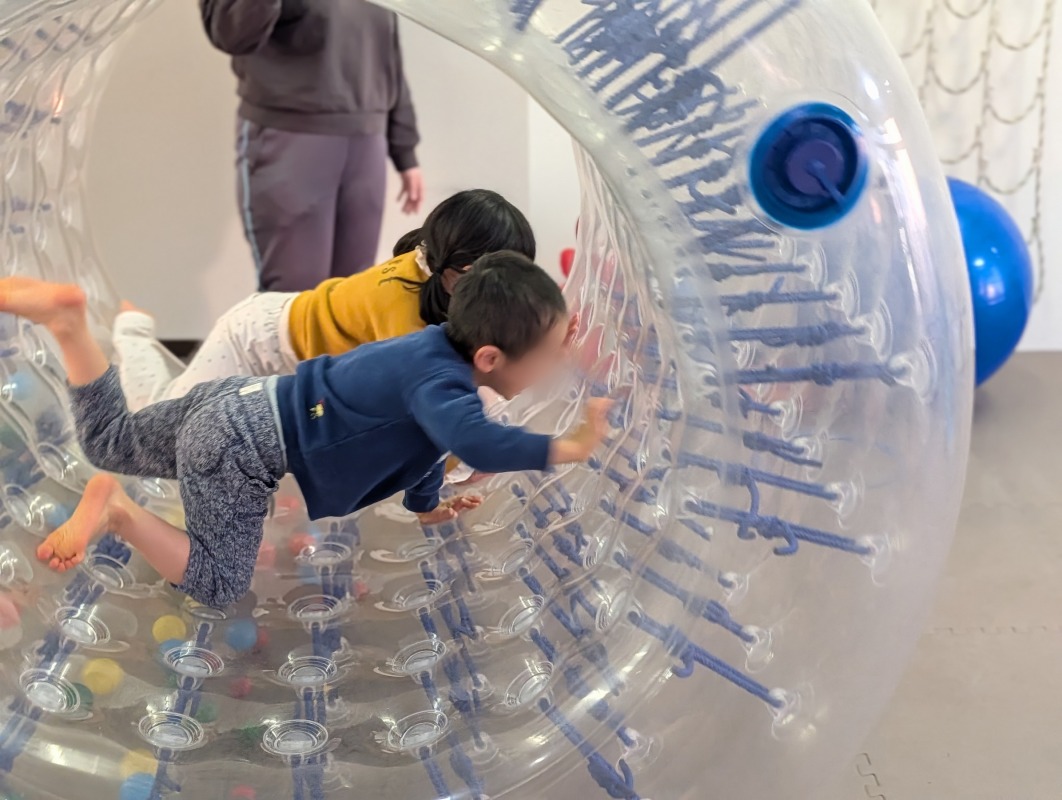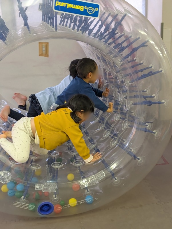 2026.2.17 一緒に回転サイバーホイール 日々のこと みんな大好きサイバーホイール。3人で中に入って、さあ、とうするのかな?みんなで協力して回転しよう!!子どもたちが、自分たちであそびを考え、発展させていく中で、発達に必要な身体の土台づくりだけではなく、他者との関わりに必要な、協調性や共感性も育んでいきます。