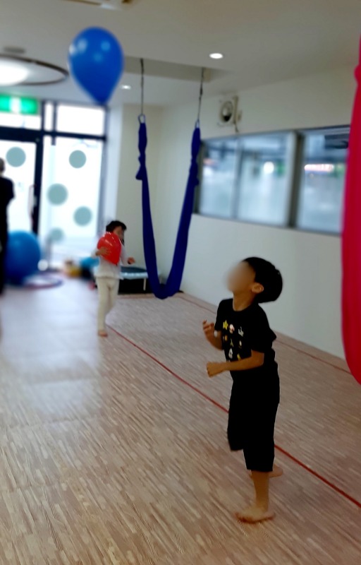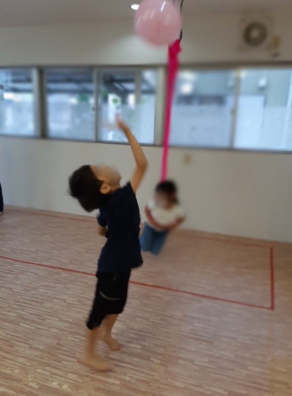2021.6.4 風船バレー 日々のこと 風船バレー。風船をよく目で見て追っています。楽しくあそびながら、知らず知らずのうちにビジョントレーニング。追視、注視、目と手の協応といった、身辺自立や学習、スポーツの土台となる「見る力」を育てていきます。