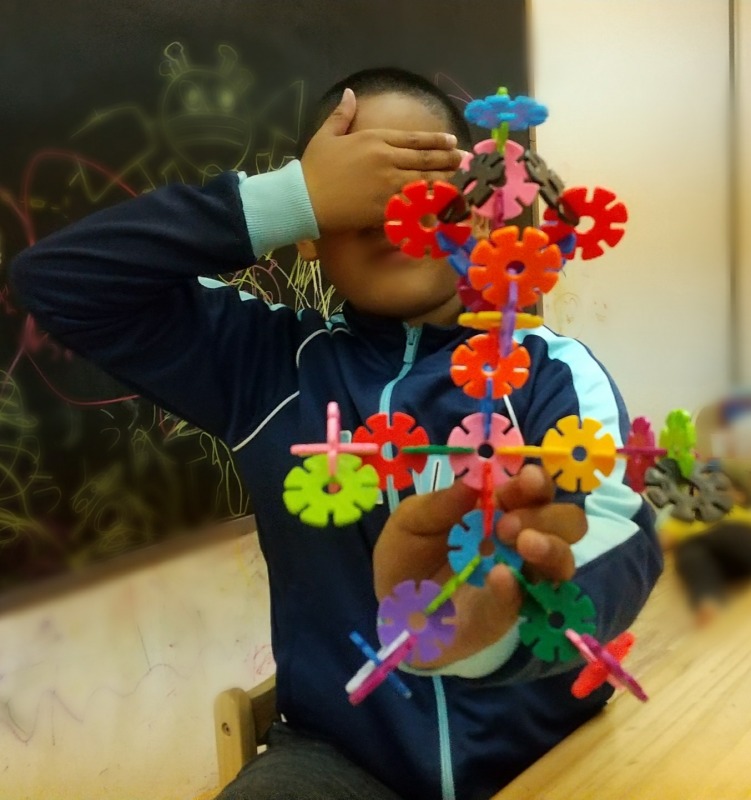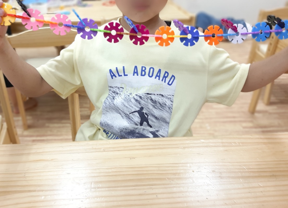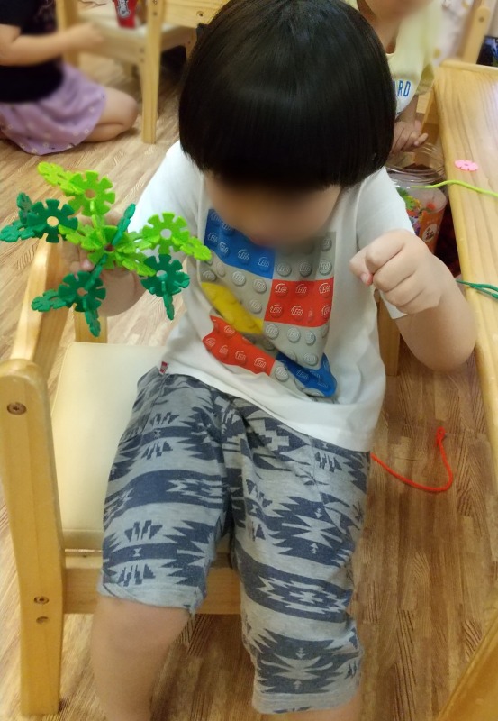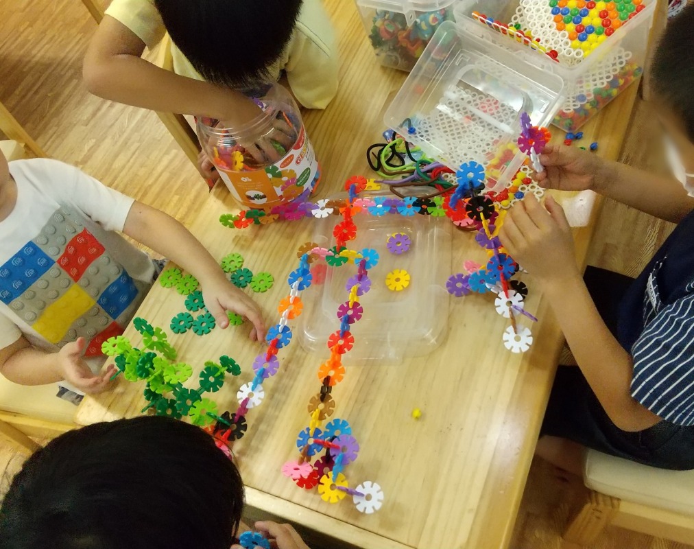 2021.6.8 想像して作ろう 日々のこと 静かなあそびの時間。みんなでブロックを使って盛り上がっています。みんな思い思いに自分の作りたい物を作っていました、なんだか強そう!長いバイクだそうです!久しぶりに大作を作りました!何も見ずに、想像して作った自分だけの作品。時間内に最後までやりきることができ、スッキリした表情をしていましたよ。