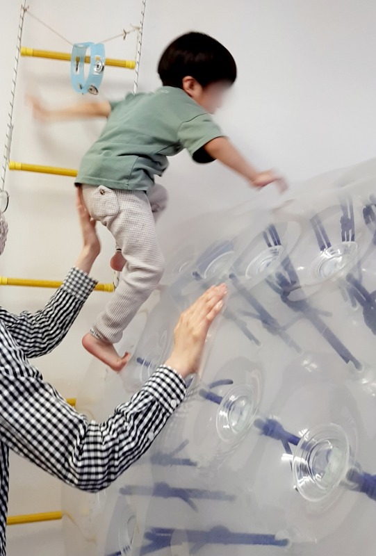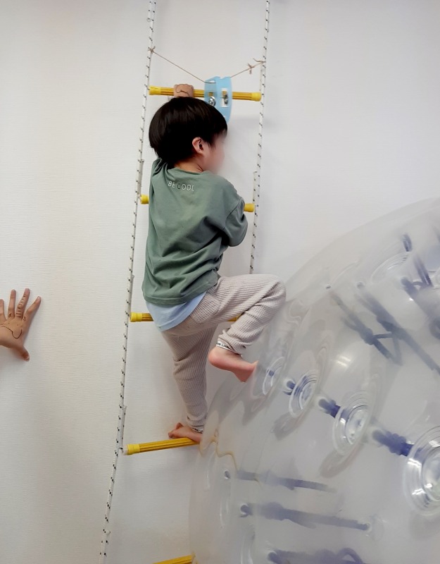 以前は、足をかけると手が離れてしまっていた子も、今ではしっかり手と足を使って登れるようになりました。