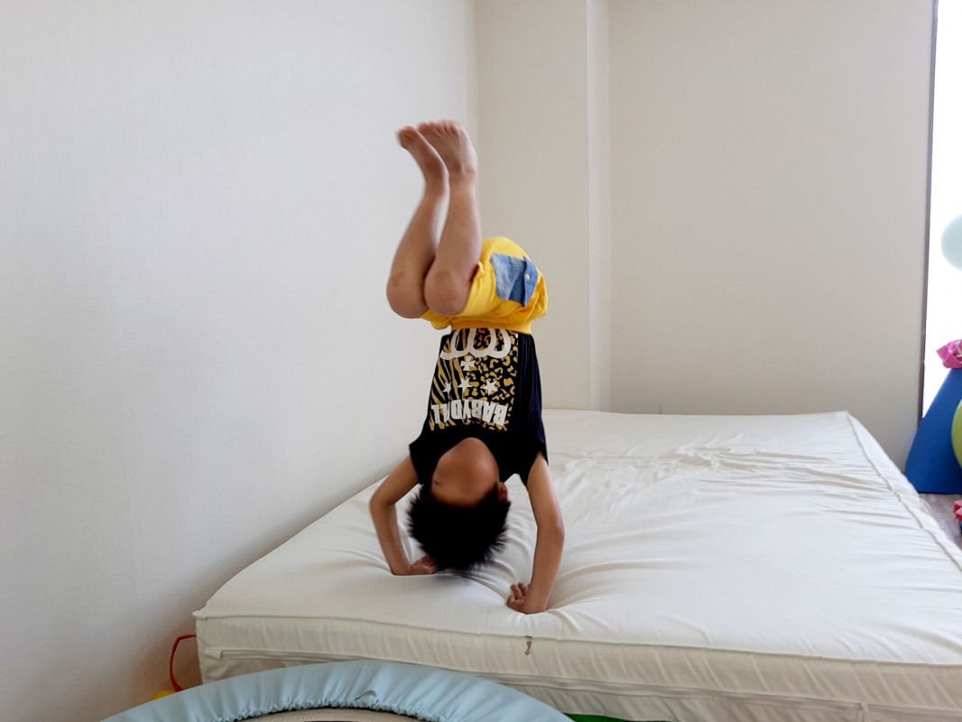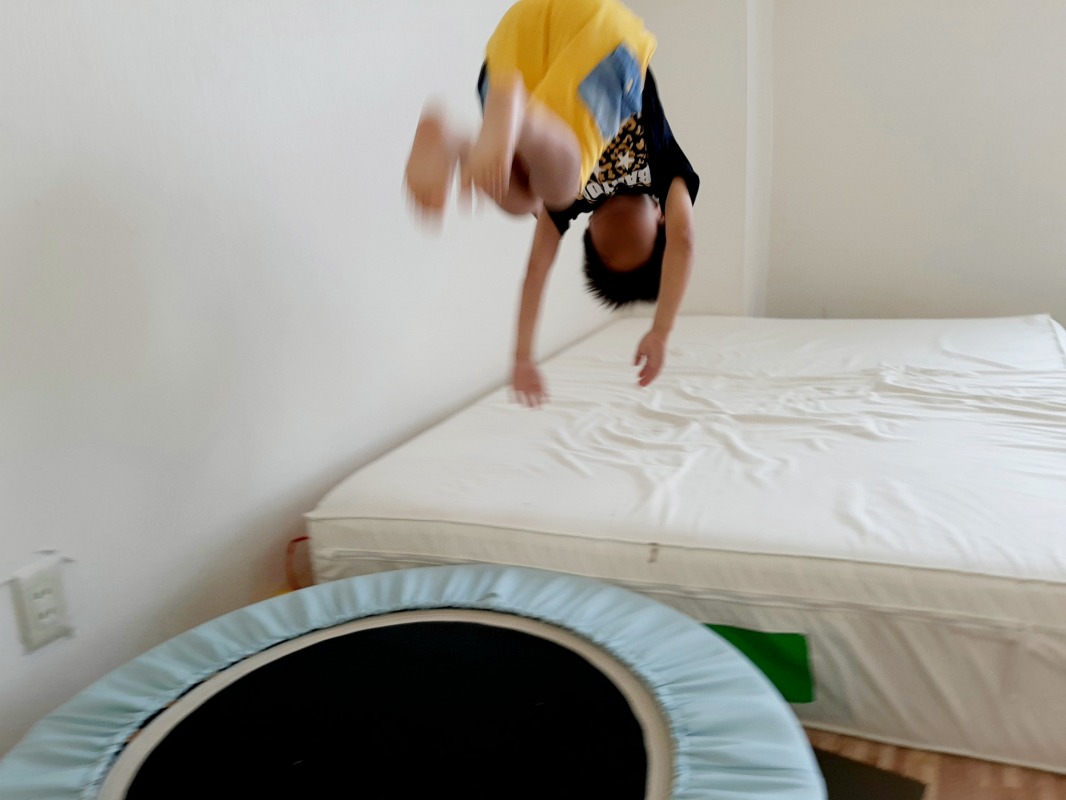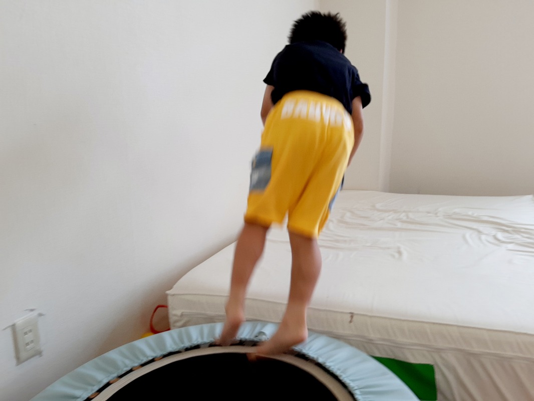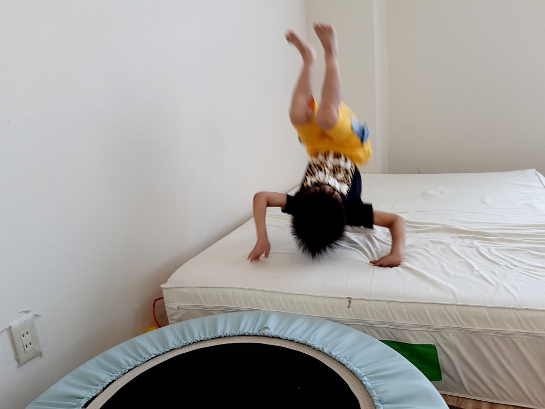 2021.6.16 宙返り 日々のこと トランポリンでジャンプして…空中でぐるっと一回転!上手に着地できました!着地する時はかなりドーンとなり、身体にしっかり圧が入ります。身体に圧を入れて「固有覚」という感覚にアプローチすることにより、力加減の調節や、運動をコントロールする力を付けていきます。それにより、声の大きさの調節、筆圧が強すぎる、弱すぎるといった社会性や学習面の課題の改善にも繋がっていきます。