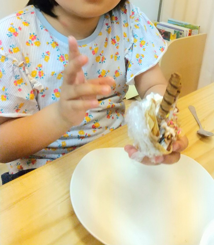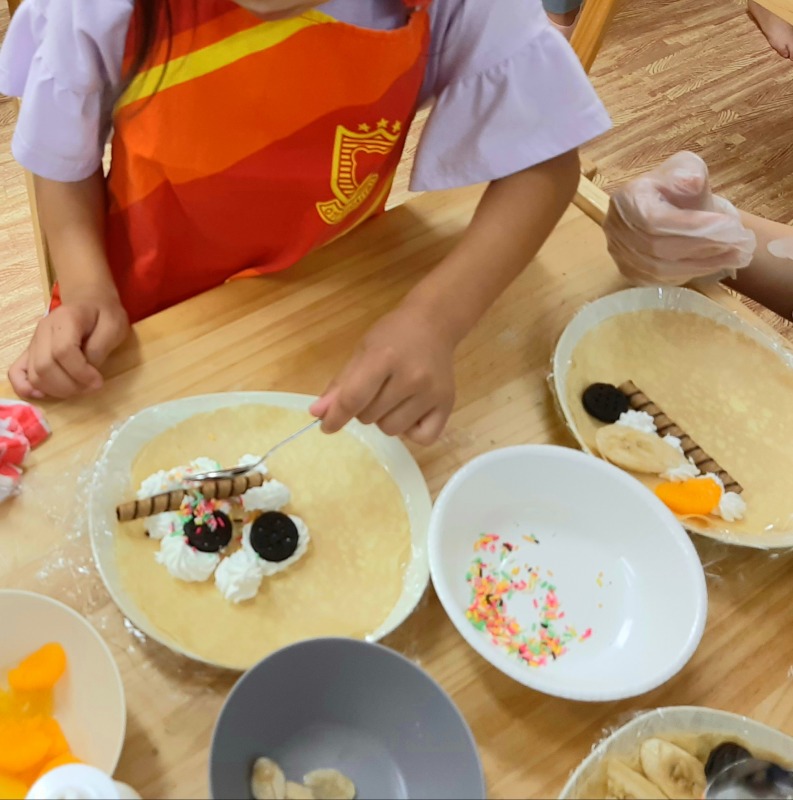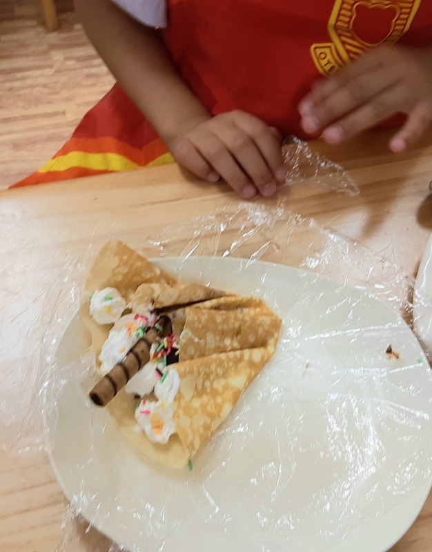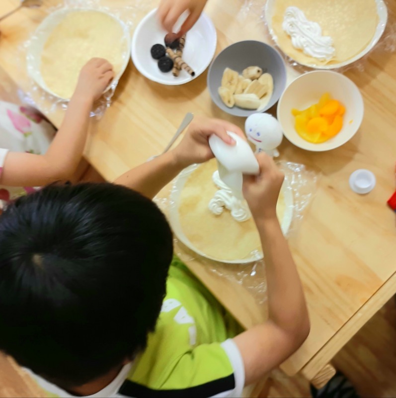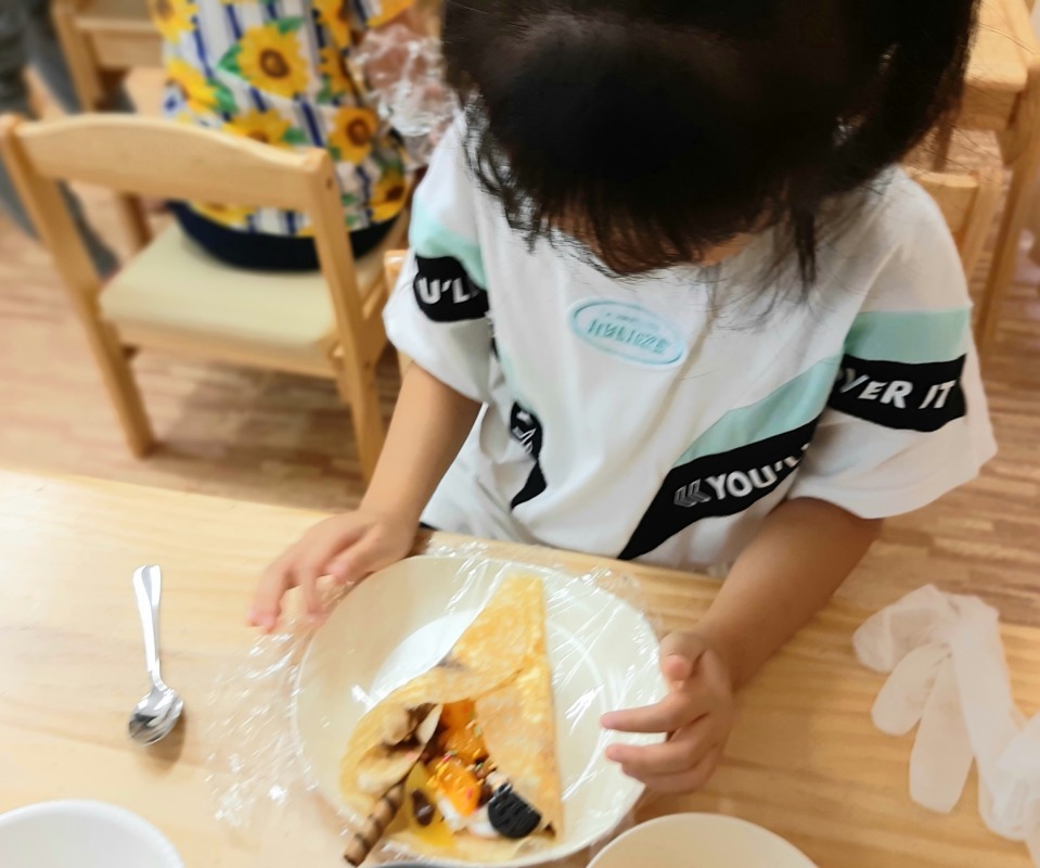 2021.6.26 クレープ作り 日々のこと 今日のイベントはクレープ作り。朝からみんなとっても楽しみにしていました。期待感から、作り方の説明やお約束の話も、とても集中して聞くことができました!ホイップは順番に使います。好きな具を自分で選んでトッピング。美味しそうなクレープが完成しました!みんなとっても嬉しそうに完成したクレープを見せてくれました。自分で作ったクレープをペロリとたいらげて、大満足のきのねの子どもたちです。