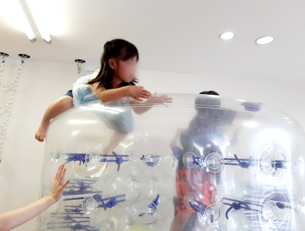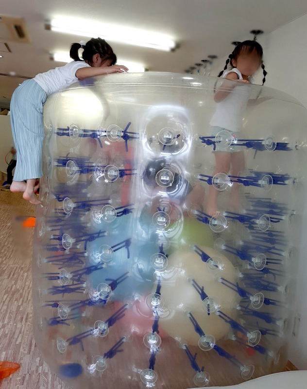 縦に置いたサイバーホイールの中にバランスボールを敷き詰めて、トランポリンにするあそびはみんな大好き。