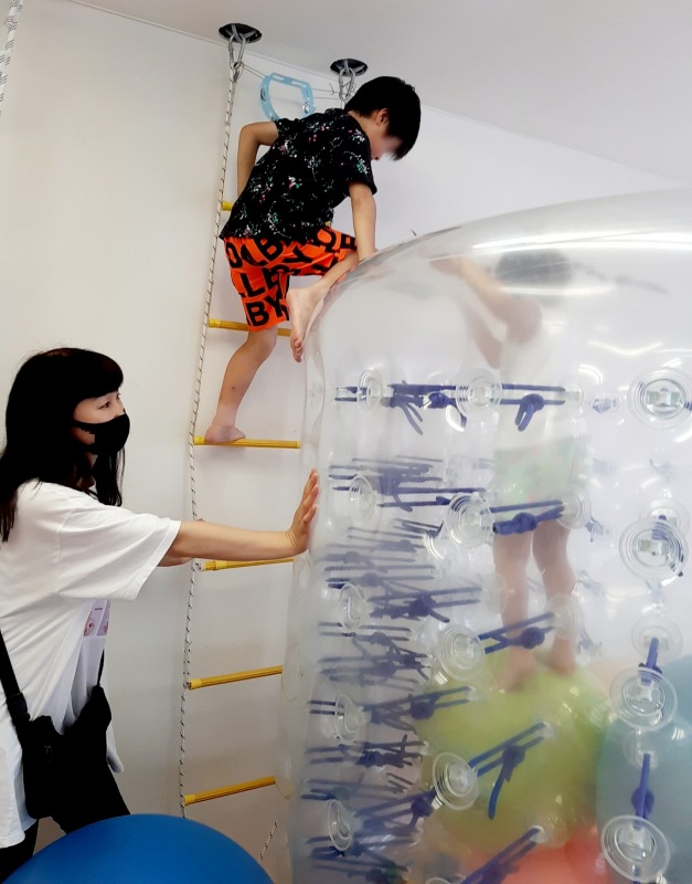 はしごを登ったり、サイバーホイールをよじ登ったり、上にしがみつくこことで、ボディイメージも育てていきます。