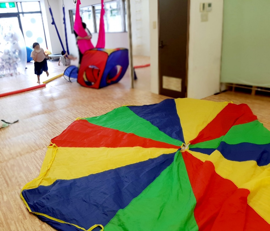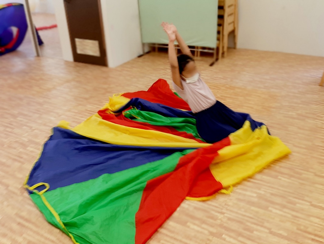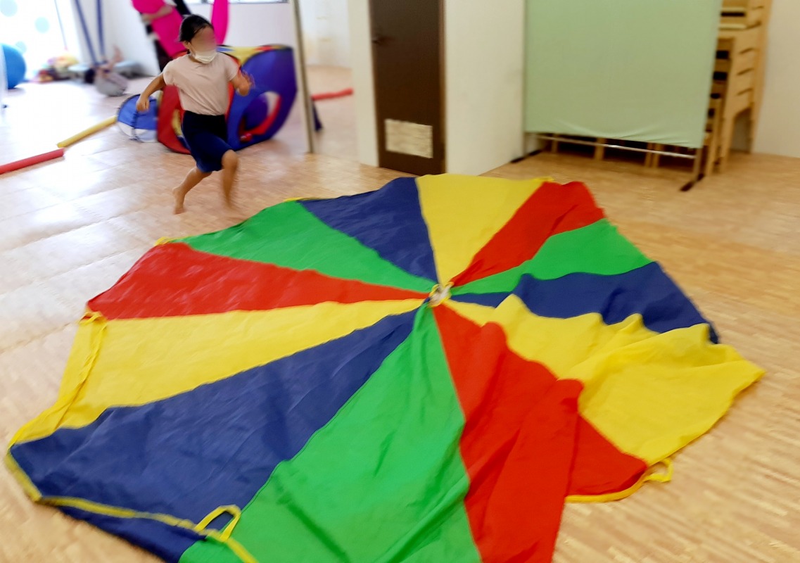 2021.7.6 パラバルーン2 日々のこと 床に広げられたパルバルーン。遠くから走ってくる子が!何が始まるのかな?パラバルーンの上を走り抜けるのかな?…って思ったらスライディング!あそび方はひとつじゃないね。子どもの発想に驚かされる日々です。可能性は無限大。