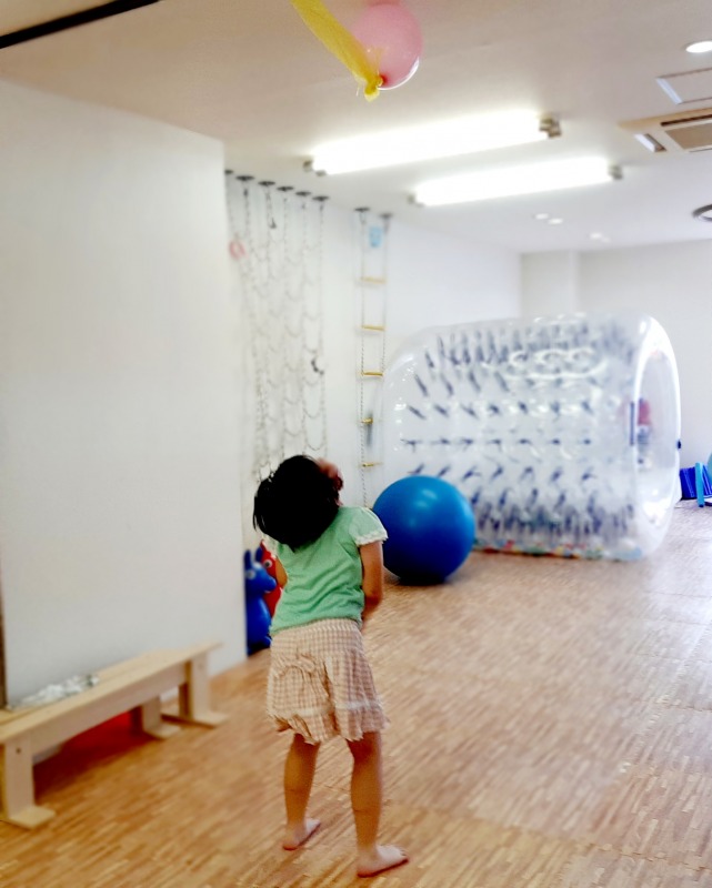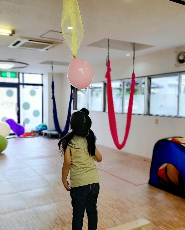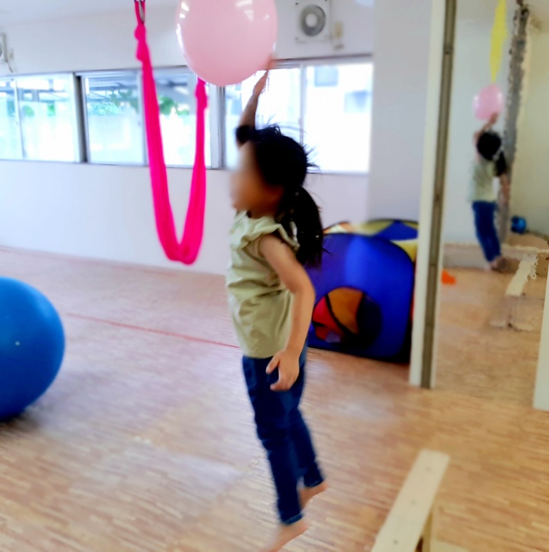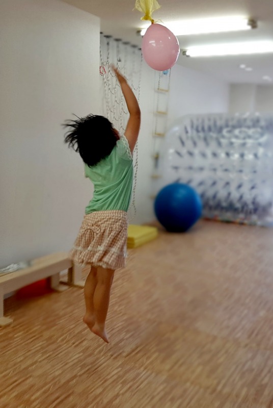 2021.7.7 とどくかな? 日々のこと 天井からぶら下げた風船。ジャンプして届くかな?しっかり狙いを定めて…ジャンプ!!小さい子は平均台の上から…ジャンプ!風船まで手が届いたね。楽しくあそびながら、注視する力、手と目の供応、視空間認知力などの、視覚認知機能も育てていきます。