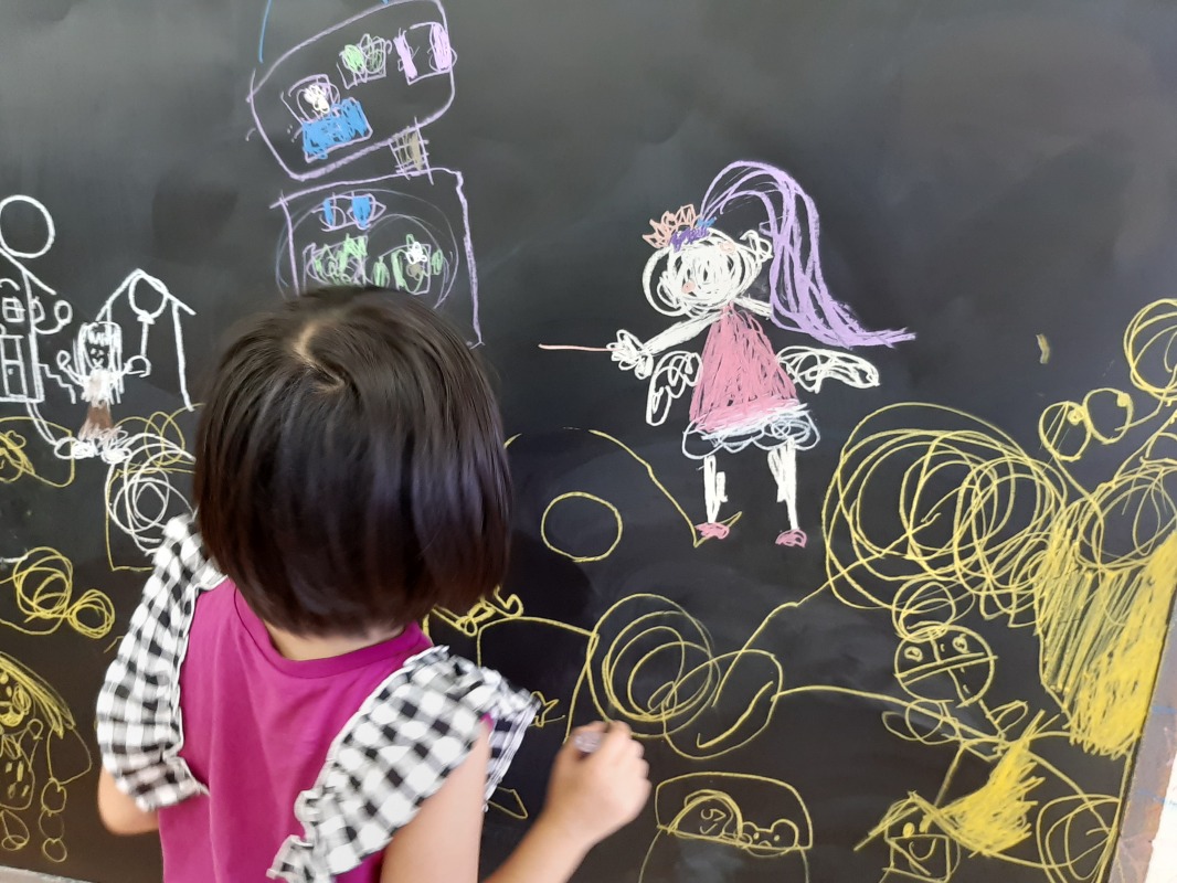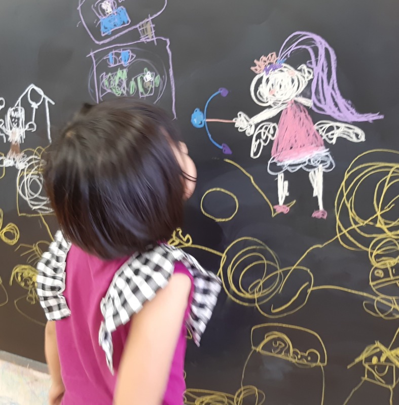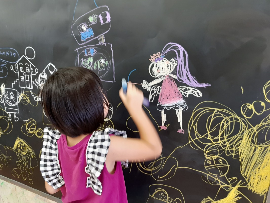 2021.7.19 イメージを膨らませて 日々のこと とっても素敵な絵を描いていました。じっと見て、何か思いついた様子。何を描いてるのかな?色使いもとても素敵な絵の完成です。きのねの黒板は、子どもたちが自由に想像力を膨らませ、満足するまで思いきり描くことができます。明日はどんな世界を見せてくれるのかな?