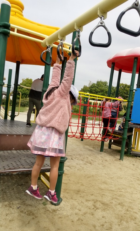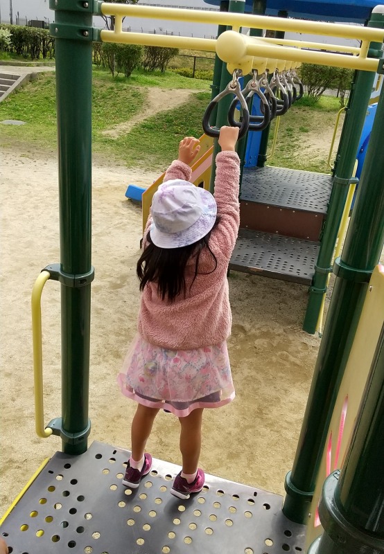 2021.4.6 向こうまでいけるかな? 日々のこと 向こうまでいけるかな?じょうずにぶらさがれたね!公園の遊具は発達の土台づくりにとっても役立ちます。「やってみたい!」「できた!嬉しい!」「もう一回やりたい!」この気持ちが発達にとってとても大事なのです。