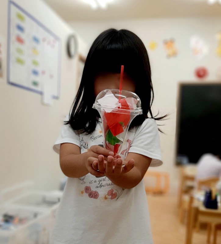 2021.8.19 カラフル☆パフェ 日々のこと お弁当の後、夏休みの宿題に取り組んだら、自由に工作やパズル、手先を使ったあそびなどをする、静かなあそびの時間。パフェの器を置いておくと、すぐにイメージが湧いたようで、折り紙を使い、集中して作っていました。カラフルで美味しそう!夏らしいとても素敵なパフェができあがりましたよ。