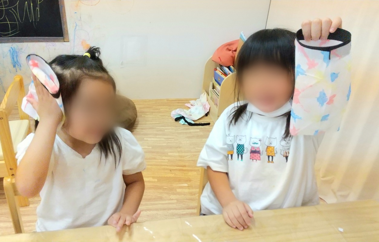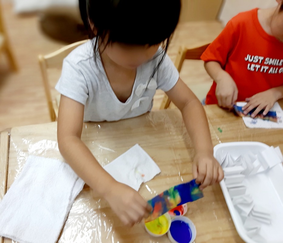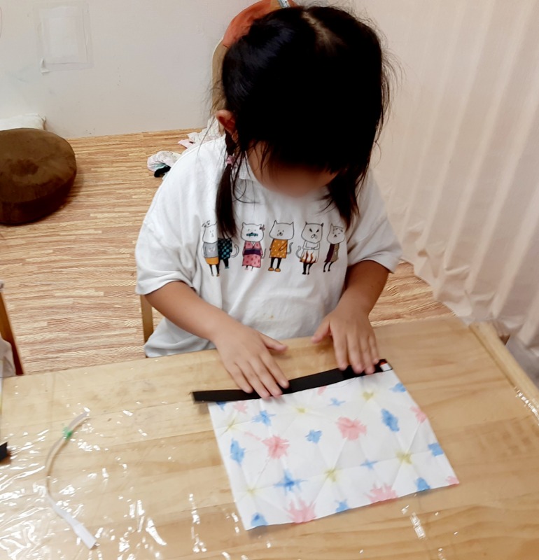 事前に、破れてもテープで止めれば大丈夫だよ、たくさんあるから何枚作ってもいいよ、という事を話してあったからか、みんなとても落ち着いて取り組むことができました。