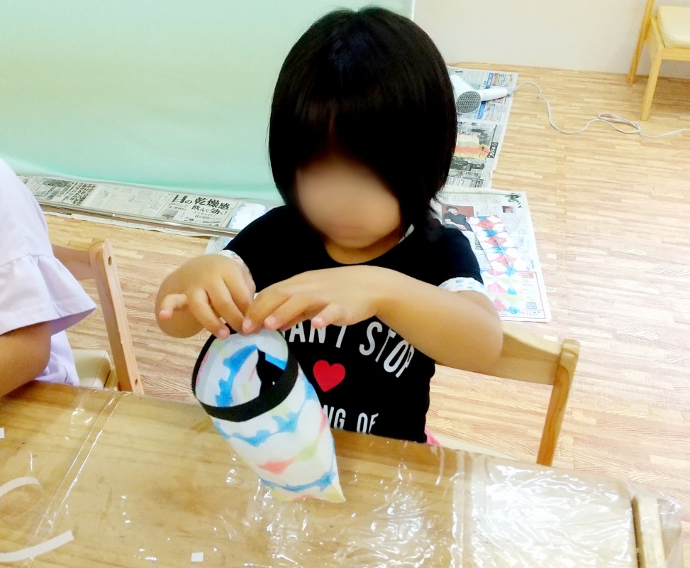 スイカ割りの前は、夏祭り準備として、提灯づくりをしました。