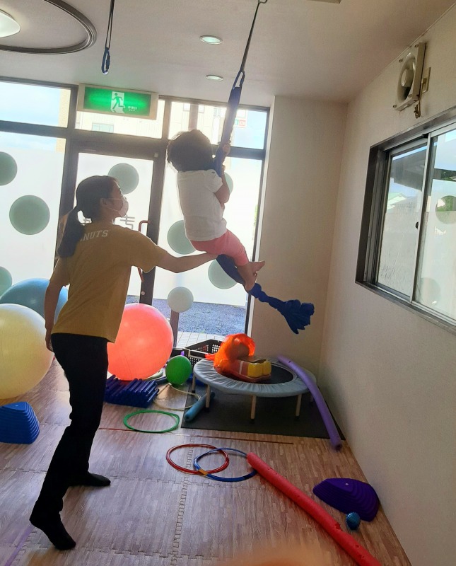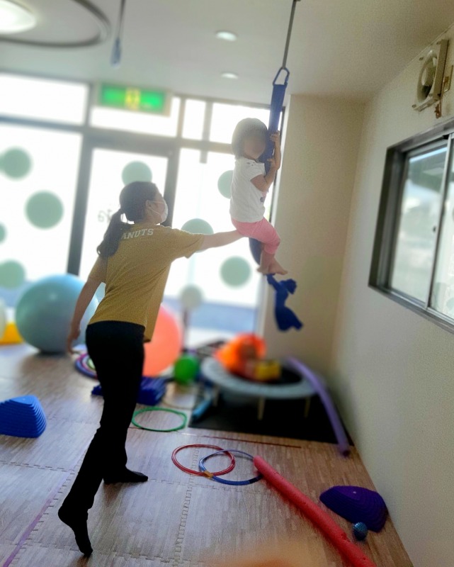 2021.8.25 しっかりしがみつこう 日々のこと 片方はずしたハンモックにしがみついて揺らしてもらっています。重力に逆らって「しがみつく」という運動は、発達にとってとても大切。体幹や、ボディイメージを育てるのに役立ちます。しっかりしがみついて、姿勢も安定していますね。もちろん、ニコニコ笑顔は弾けていましたよ。
