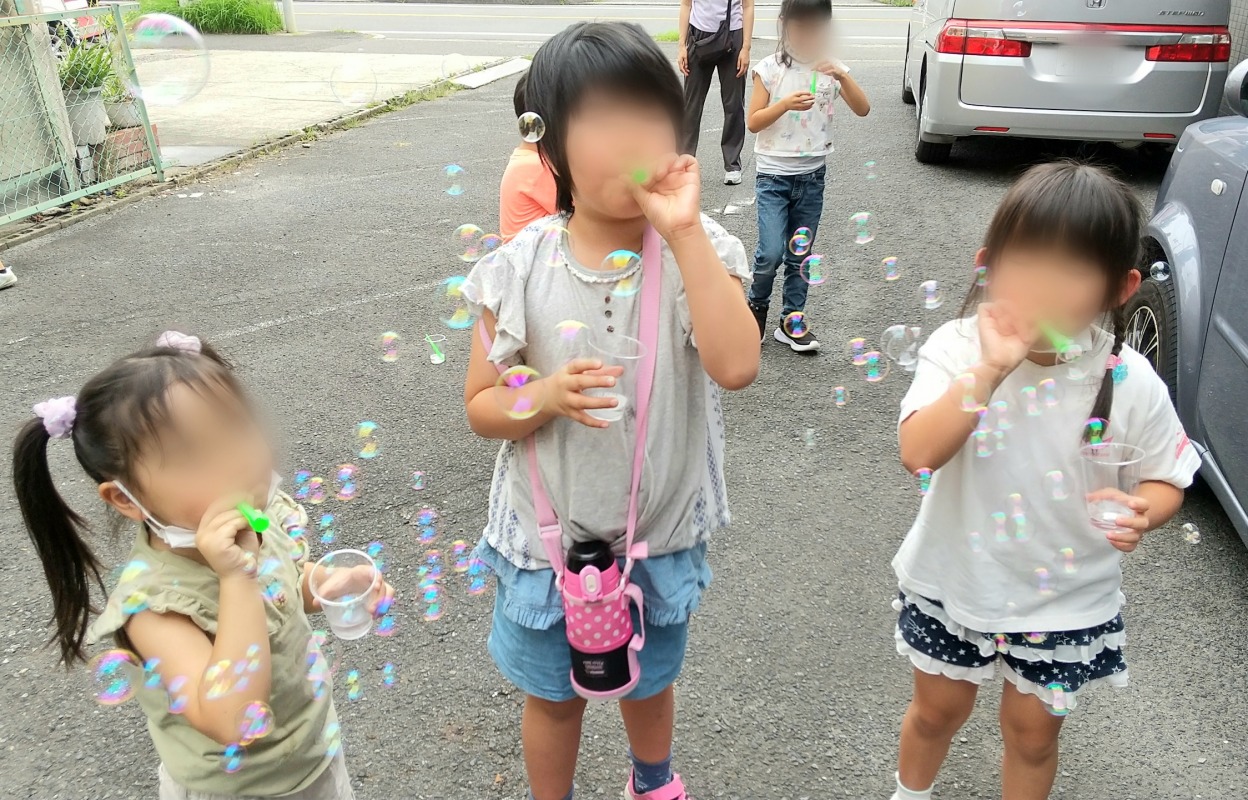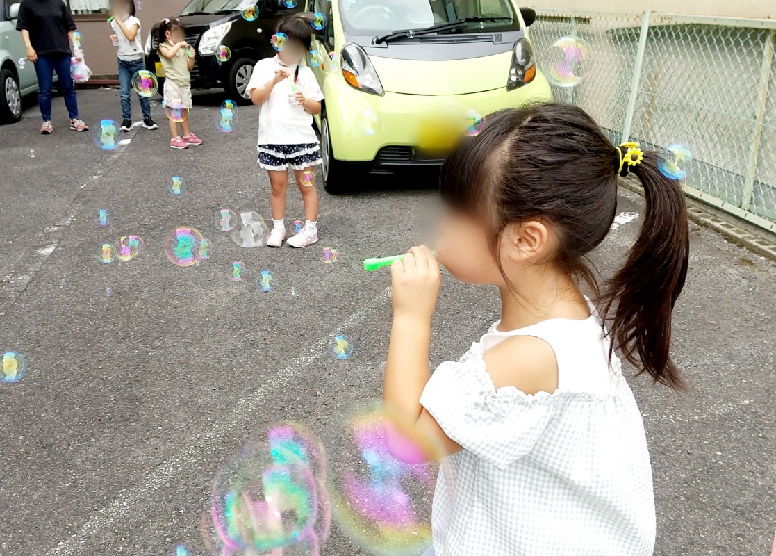 2021.8.26 しゃぼん玉 日々のこと 久しぶりに晴れた今日、きのねの駐車場でシャボン玉をしました。そぉ~と吹いて、大きなシャボン玉ができました。せーので吹いてできた、たくさんのシャボン玉。どこまで飛んでいくのかな。